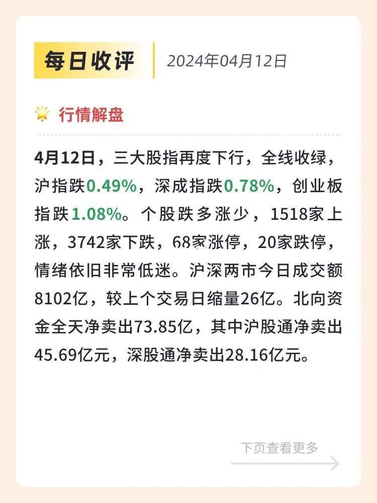 👉 4月12日,三大股指再度下行,全线收绿,沪指跌0.49%,深成指跌0.78%,创业板指跌1.08%。个股跌多涨少,1518家上涨,3742家下跌,68家涨停,20家跌停,情绪依旧非常低迷。沪深两市今日成交额8102亿,较上个交易日缩量26亿。北向资金全天净卖出73.85亿,其中沪股通净卖出45.69亿元,深股通净卖出28.16亿元。