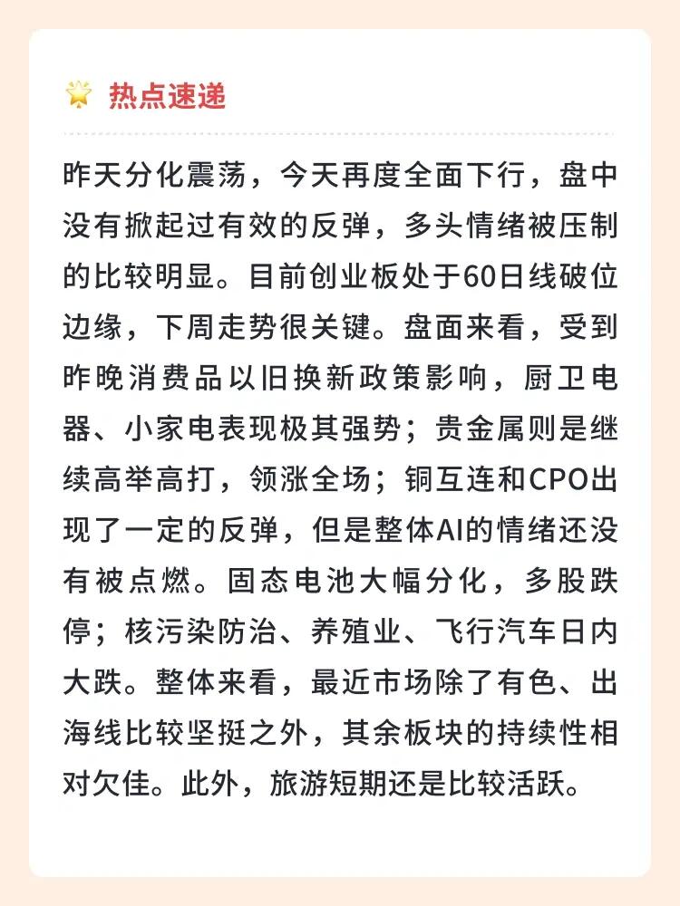 👉 昨天分化震荡,今天再度全面下行,盘中没有掀起过有效的反弹,多头情绪被压制的比较明显。目前创业板处于60日线破位边缘,下周走势很关键。盘面来看,受到昨晚消费品以旧换新政策影响,厨卫电器、小家电表现极其强势;贵金属则是继续高举高打,领涨全场;铜互连和CPO出现了一定的反弹,但是整体AI的情绪还没有被点燃。固态电池大幅分化,多股跌停;核污染防治、养殖业、飞行汽车日内大跌。整体来看,最近市场除了有色、出海线比较坚挺之外,其余板块的持续性相对欠佳。此外,旅游短期还是比较活跃。