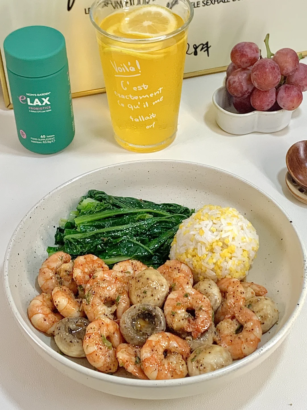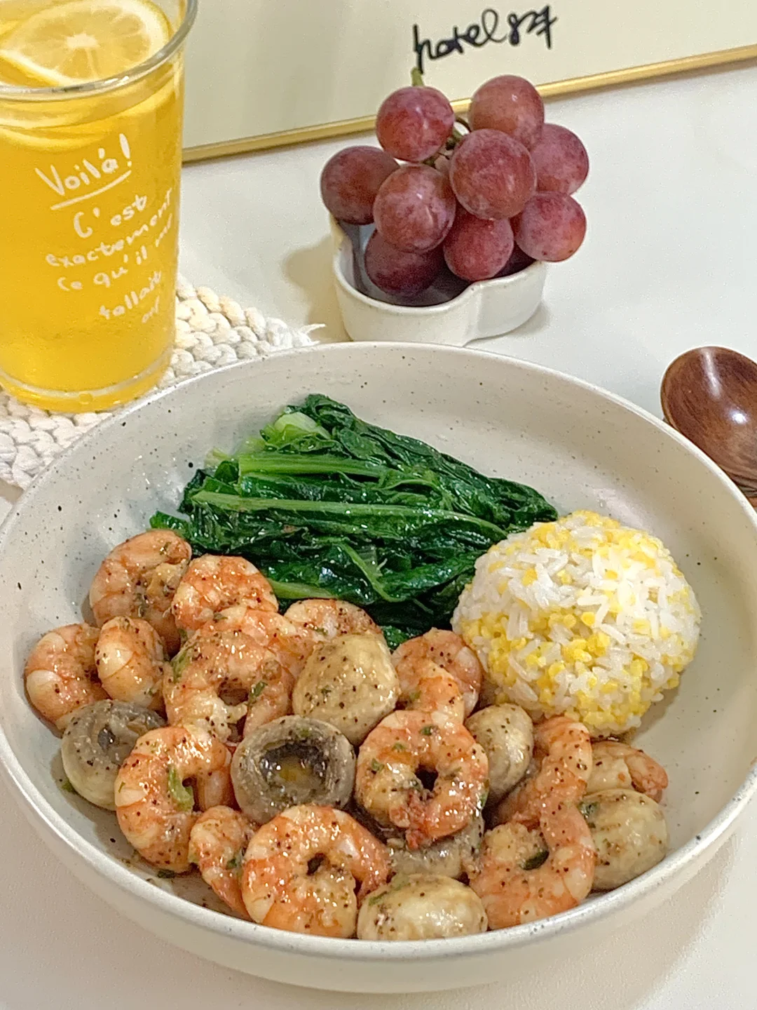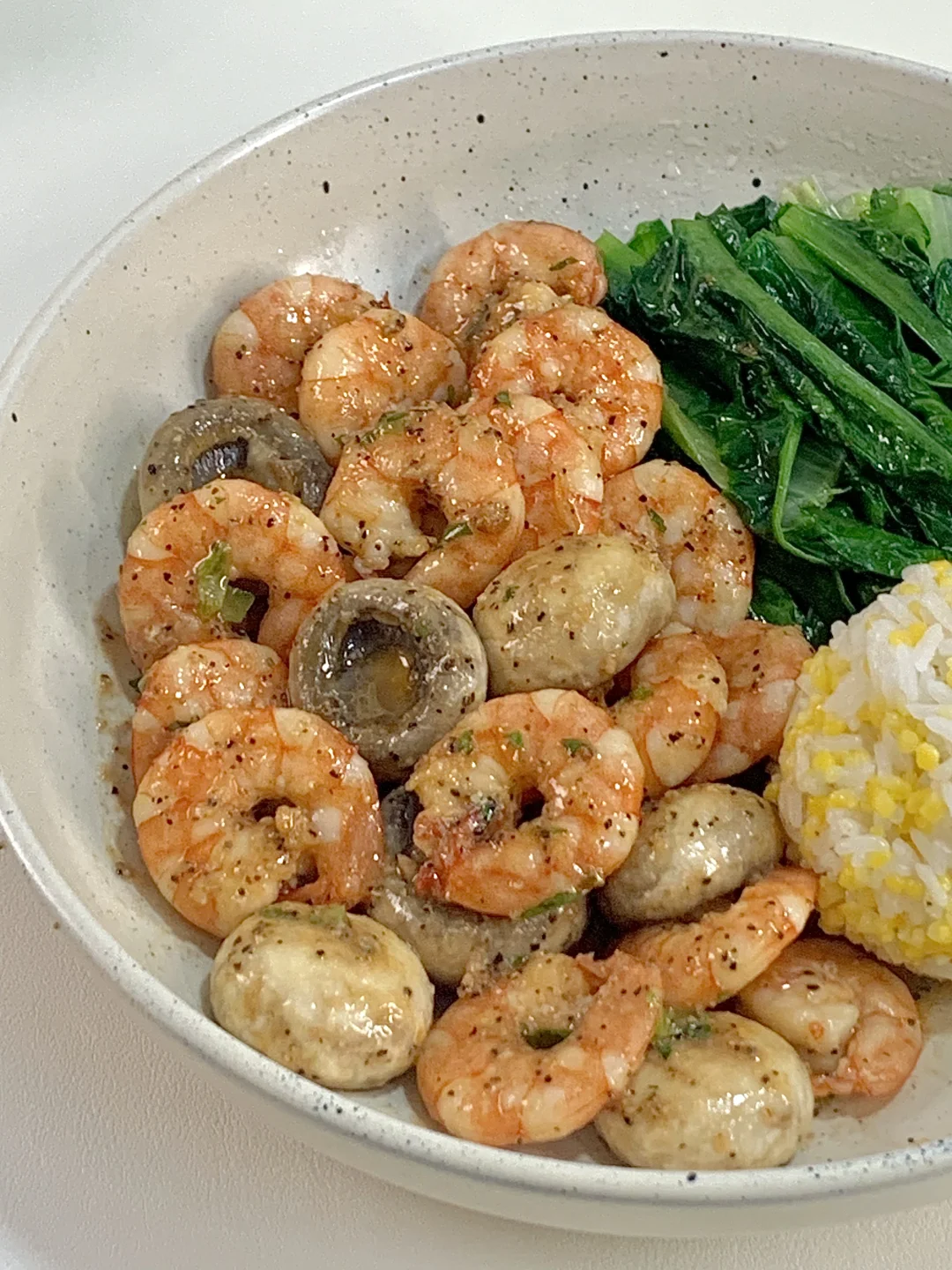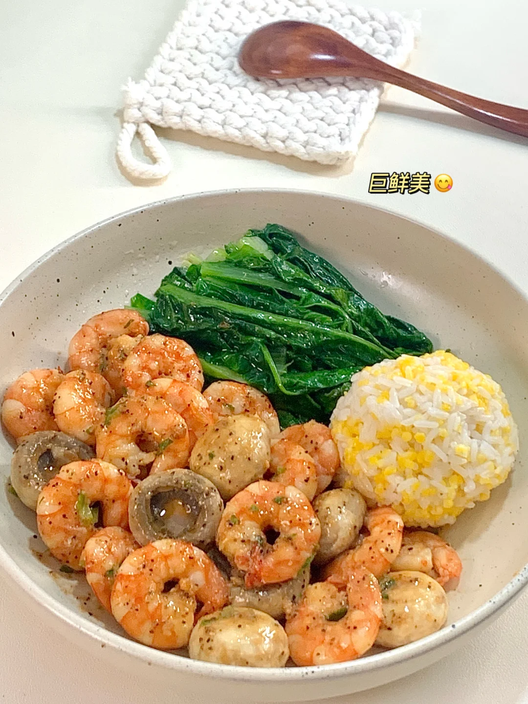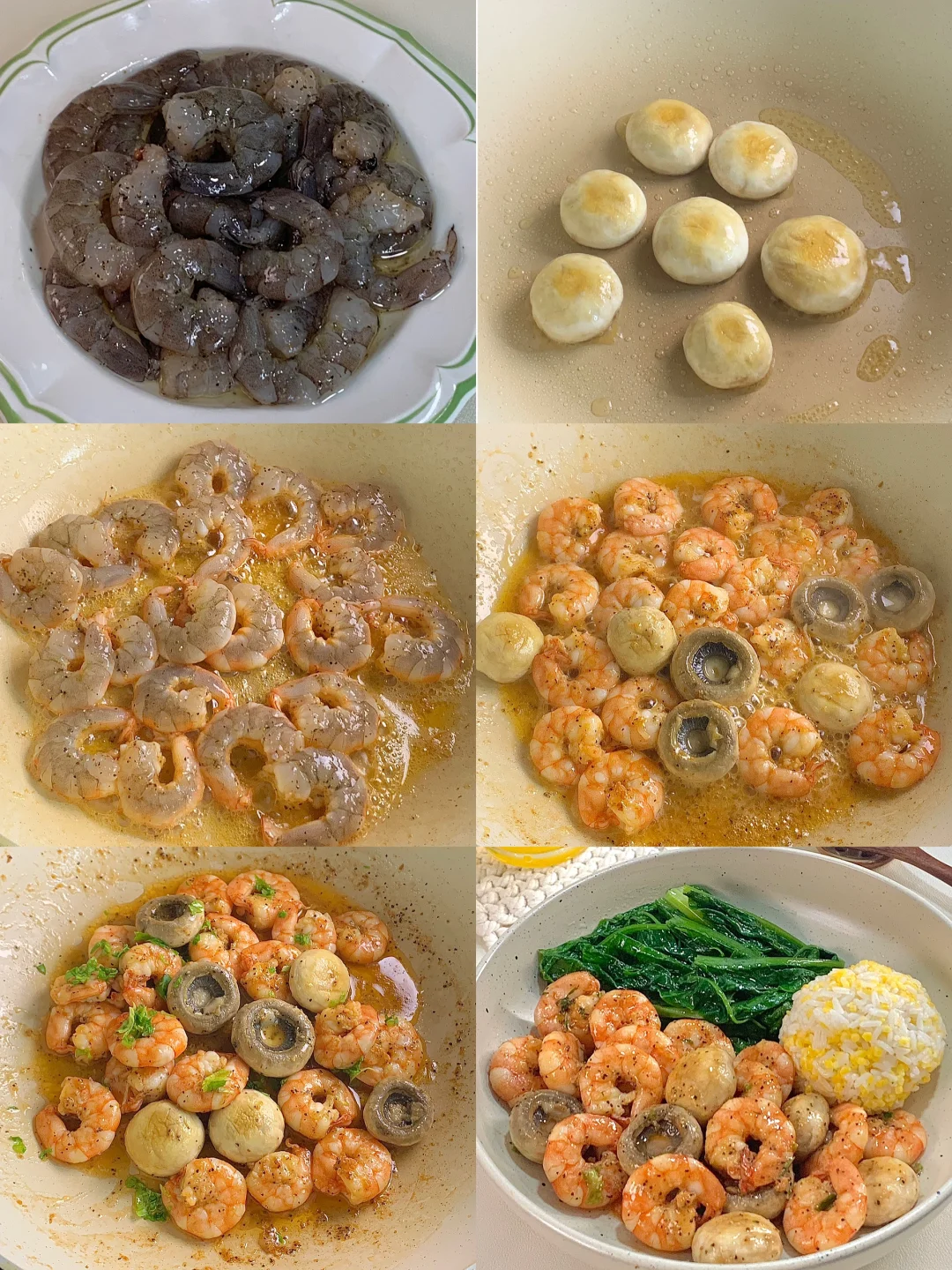 📝食材:口蘑、虾仁、油麦菜、一拳头玉米饭