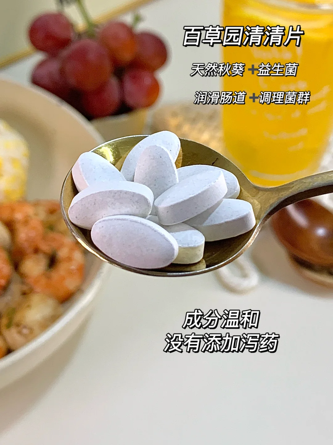 还好有百草园清清片,它可是肠道健康的“守护星”,主要成分是植物秋葵+益生菌,蠕动更有劲,还能增加有益菌,养成规律习惯