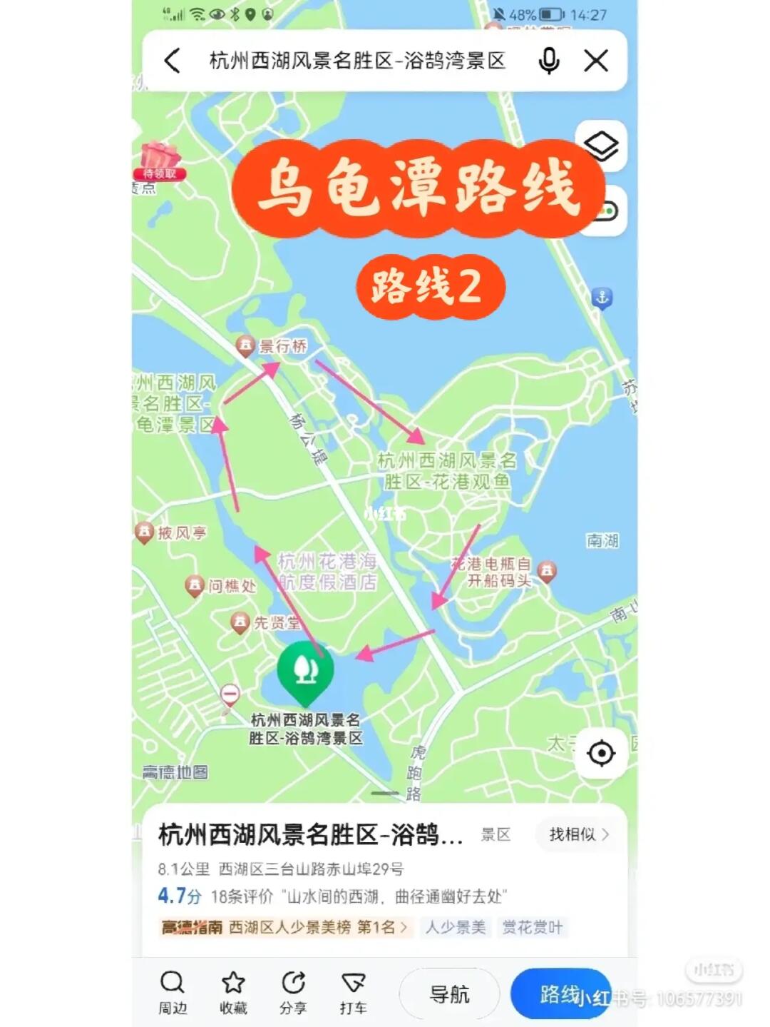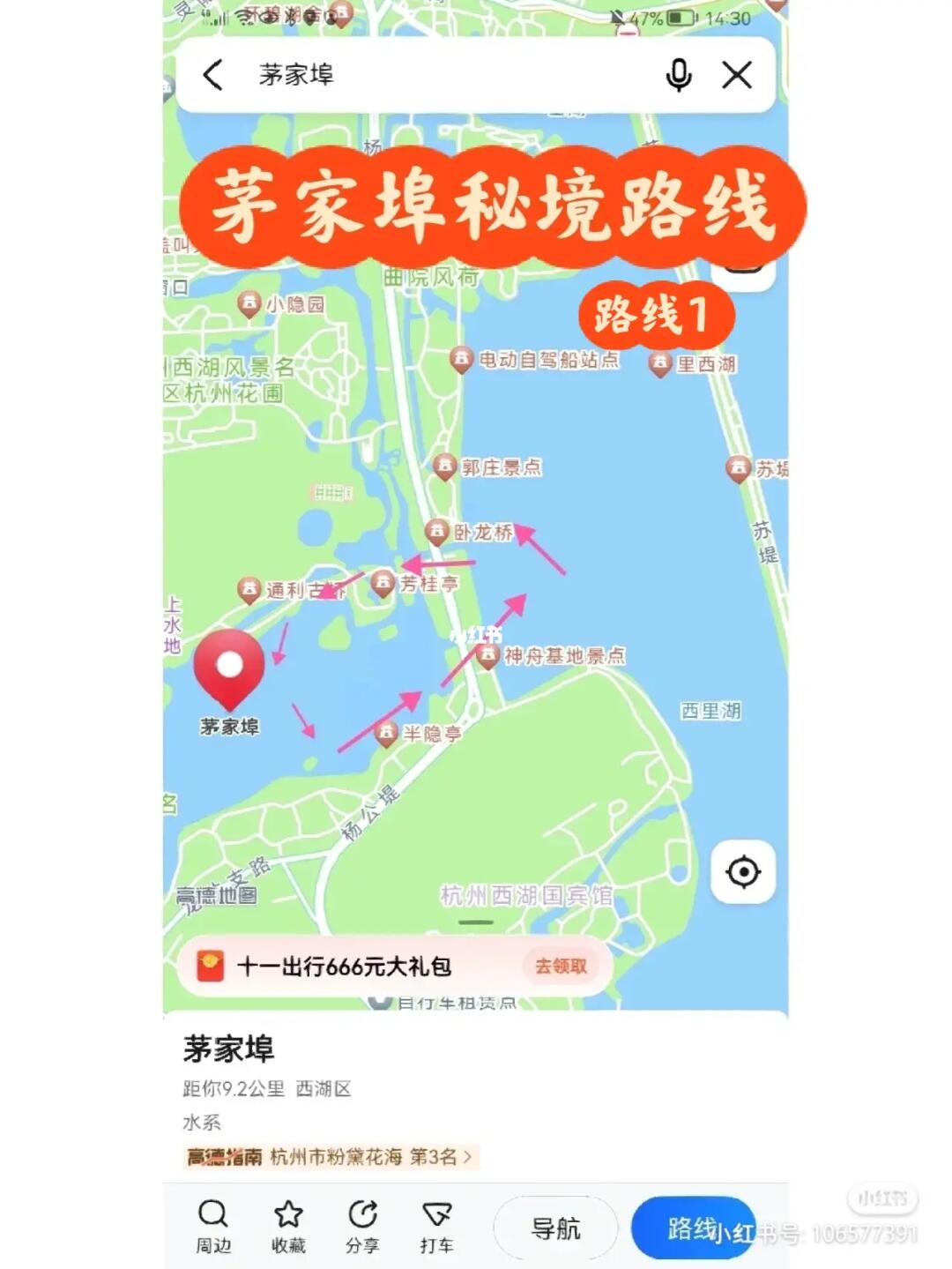 导航到花港观鱼码头(苏堤和花港观鱼交界处)