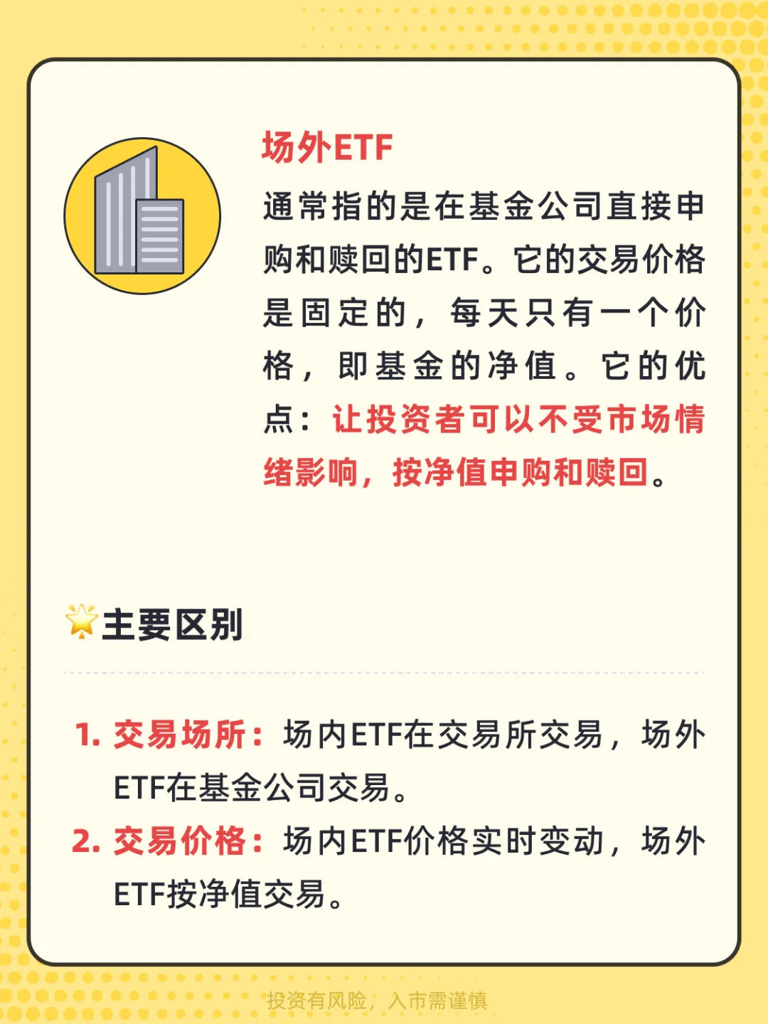 🏦【场内ETF】 场内ETF,就像是股票一样,在证券交易所里交易。你可以在交易时间内随时买卖,价格会随着市场供需实时变动。它的优点是交易灵活,费用低,适合喜欢短线操作的投资者。