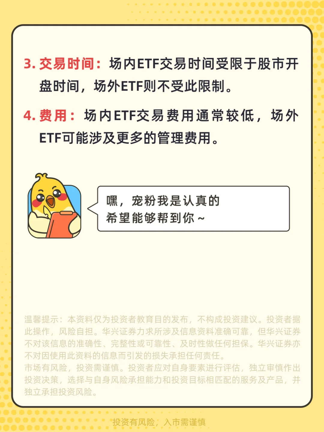 交易时间:场内ETF交易时间受限于股市开盘时间,场外ETF则不受此限制。