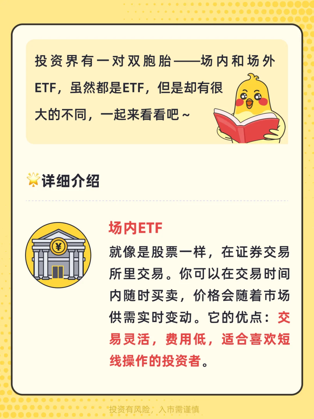 🔍投资界有一对双胞胎——场内和场外ETF,它们虽然都是ETF但是有很大的不同,下面我来讲解一下吧~