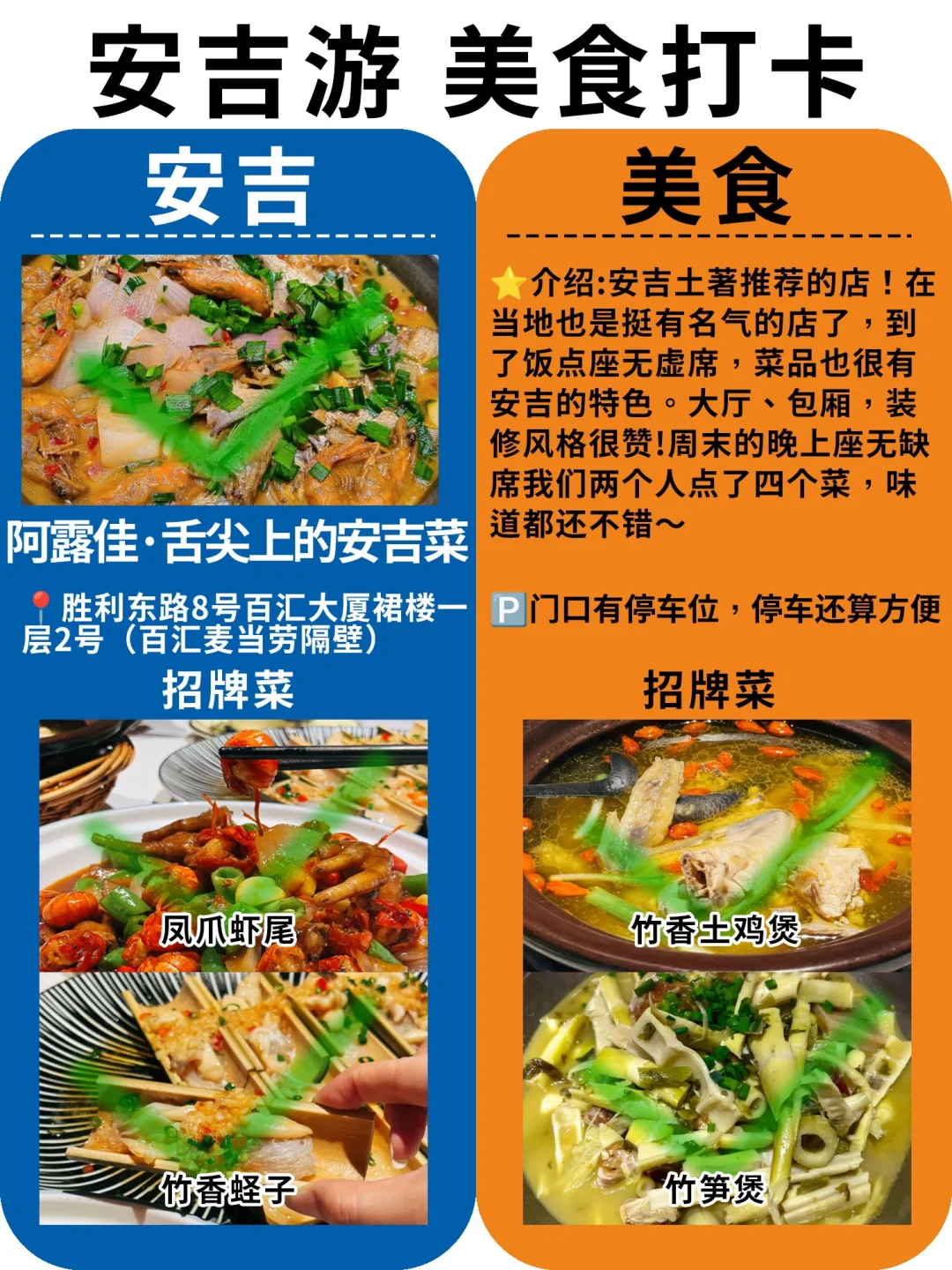 ·阿露佳·舌尖上的安吉菜:凤爪虾尾、竹香蛏子、竹香土鸡煲、竹笋煲、白茶糯米糍粑