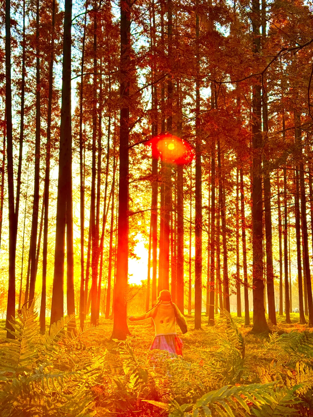 在森林中的一条走廊,人站在走廊上,拍照工具人站在下面拍,hin出片