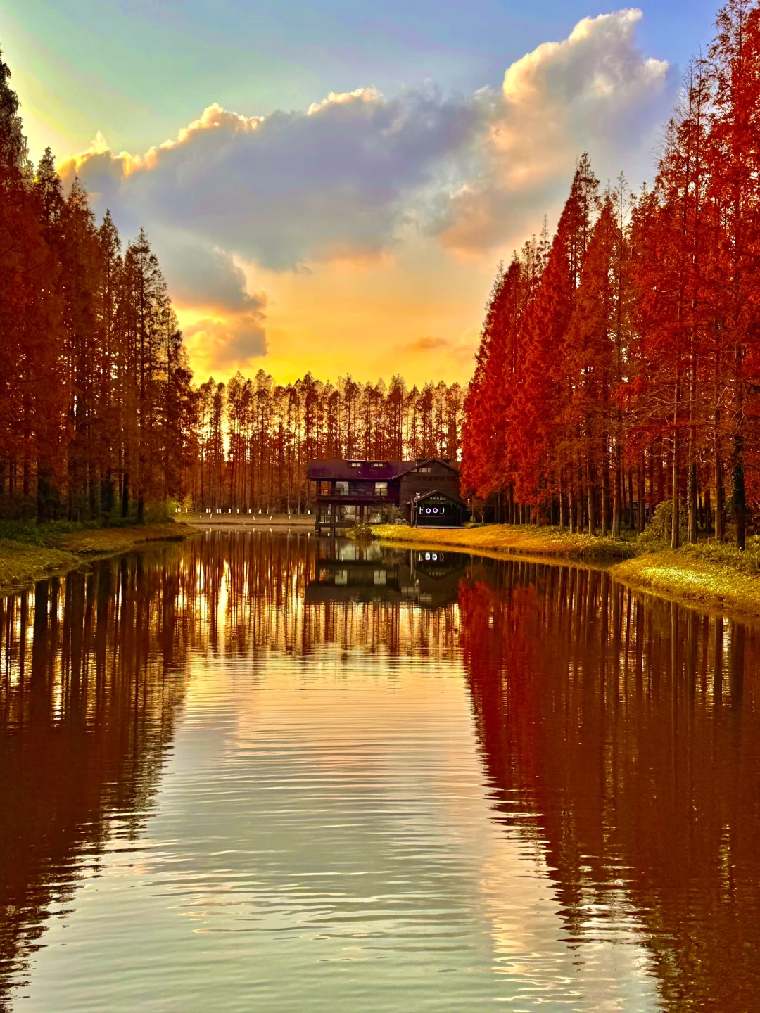 被杉树林环绕的湖边小木屋,湖面可拍出倒影