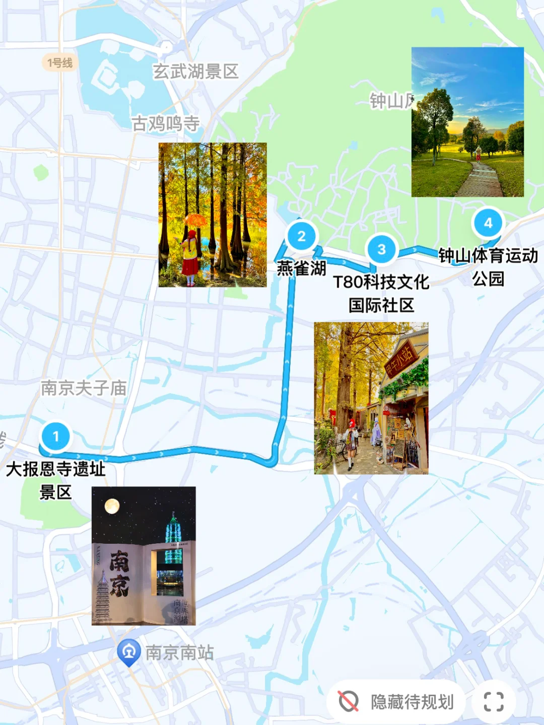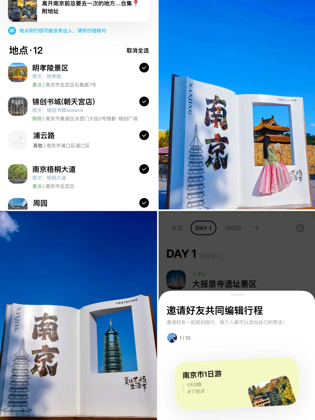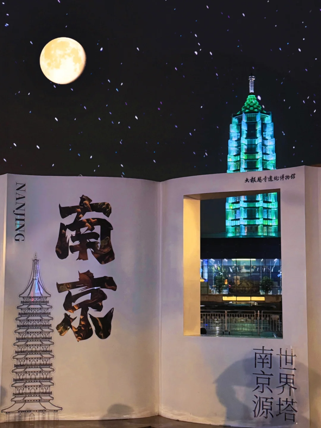 ➏大报恩寺|晚上可以看大报恩寺的琉璃塔亮灯,每天亮灯颜色都不一样哦,门口的“南京书”可以拍到和塔的合影!还有千年对望、菩提树…一些经典机位( p8 p9 p10 p12