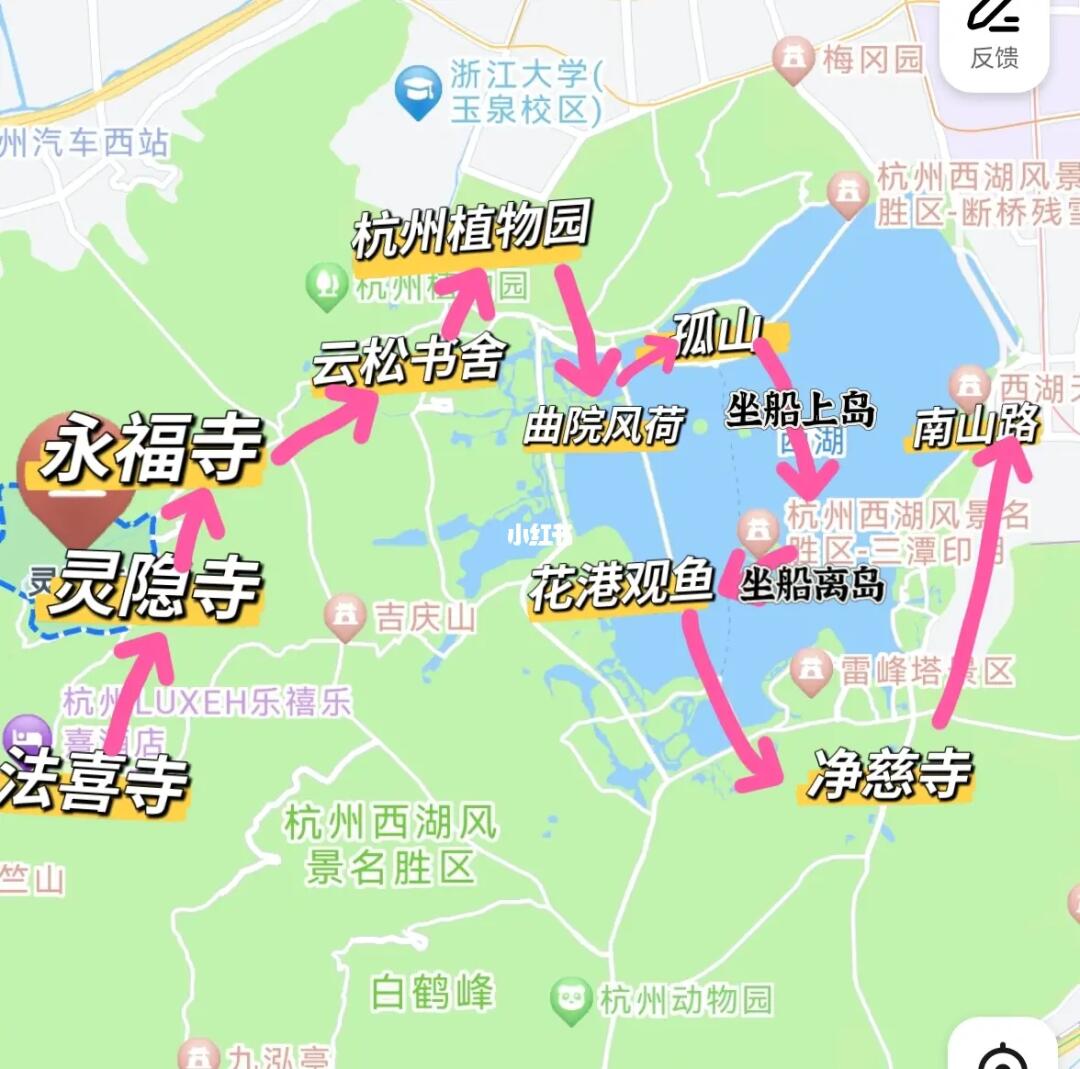 法喜寺-灵隐寺-永福寺-云松书舍-植物园-曲院风荷 -孤山-平湖秋月-三潭印月岛-花港观鱼-南屏晚钟-雷峰夕照-南山路-南宋御街