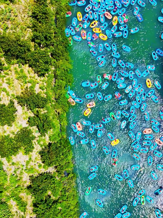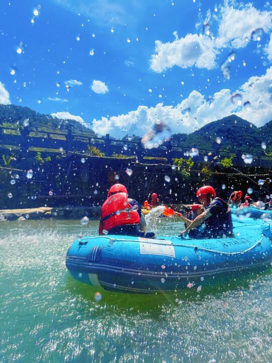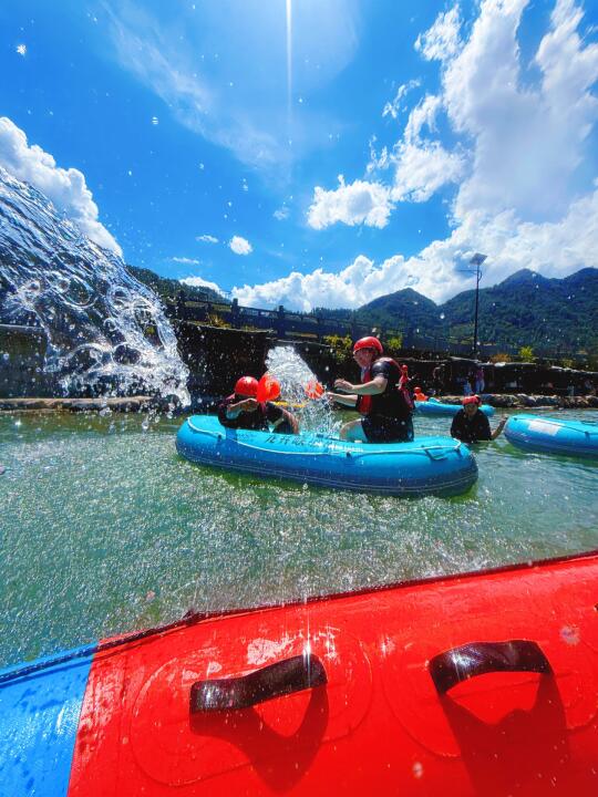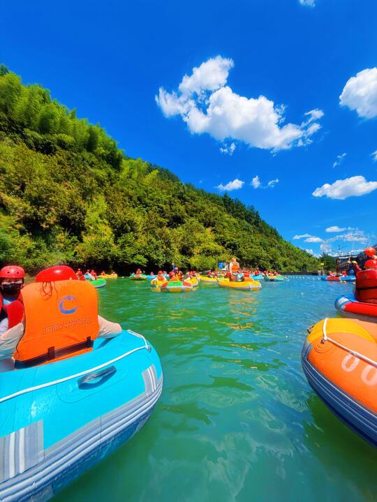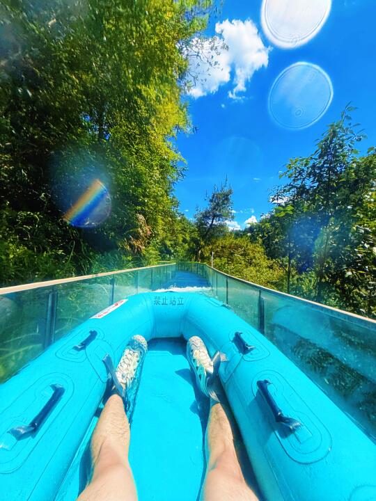 这个真的是排队人巨多!😅漂流约2小时,务必抓牢皮艇拉手哦,要连冲7个水坝!5米高陡坡“弹射起飞”,浪花直接灌满船!水巨清能见底!看我第☝️视角就知道啦!