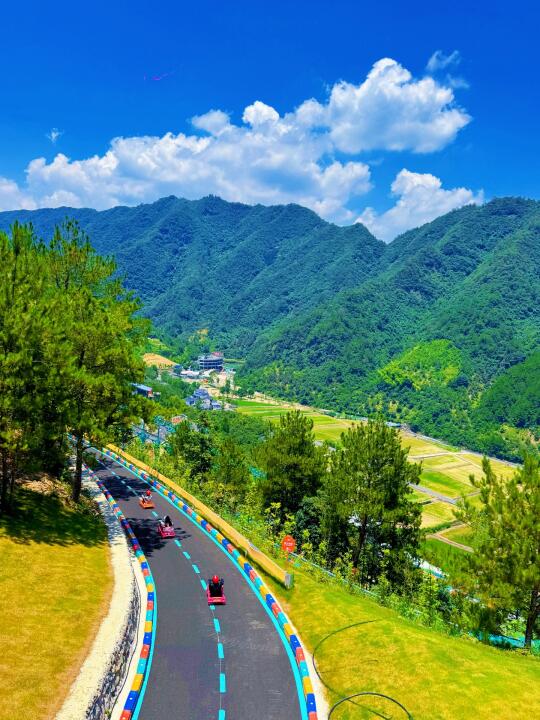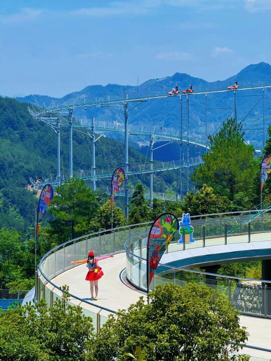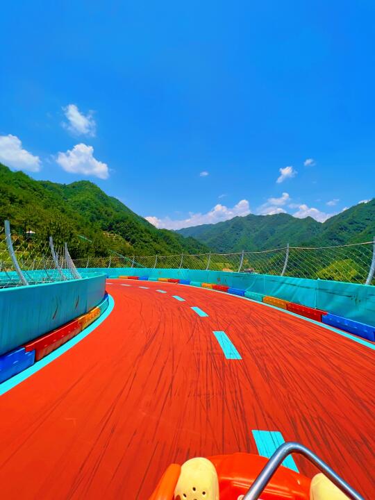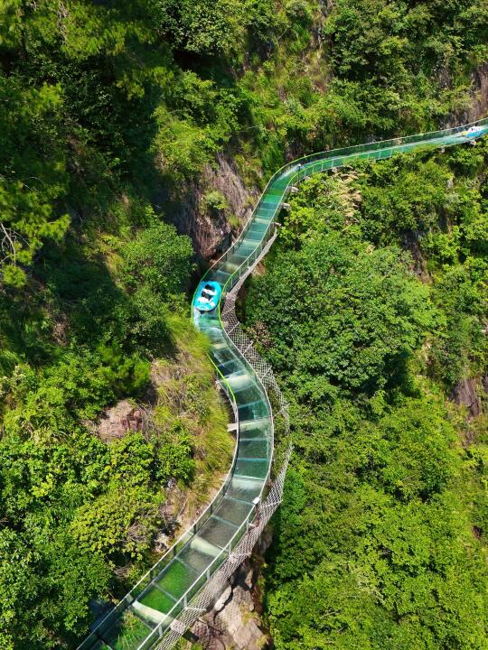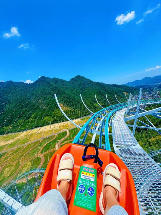 全透明的玻璃滑道,全长1.2公里,沿峭壁悬空而建,俯冲时脚下是百米深谷,视觉炸裂!全程超短,建议先玩它,再去龙井峡慢慢嗨~