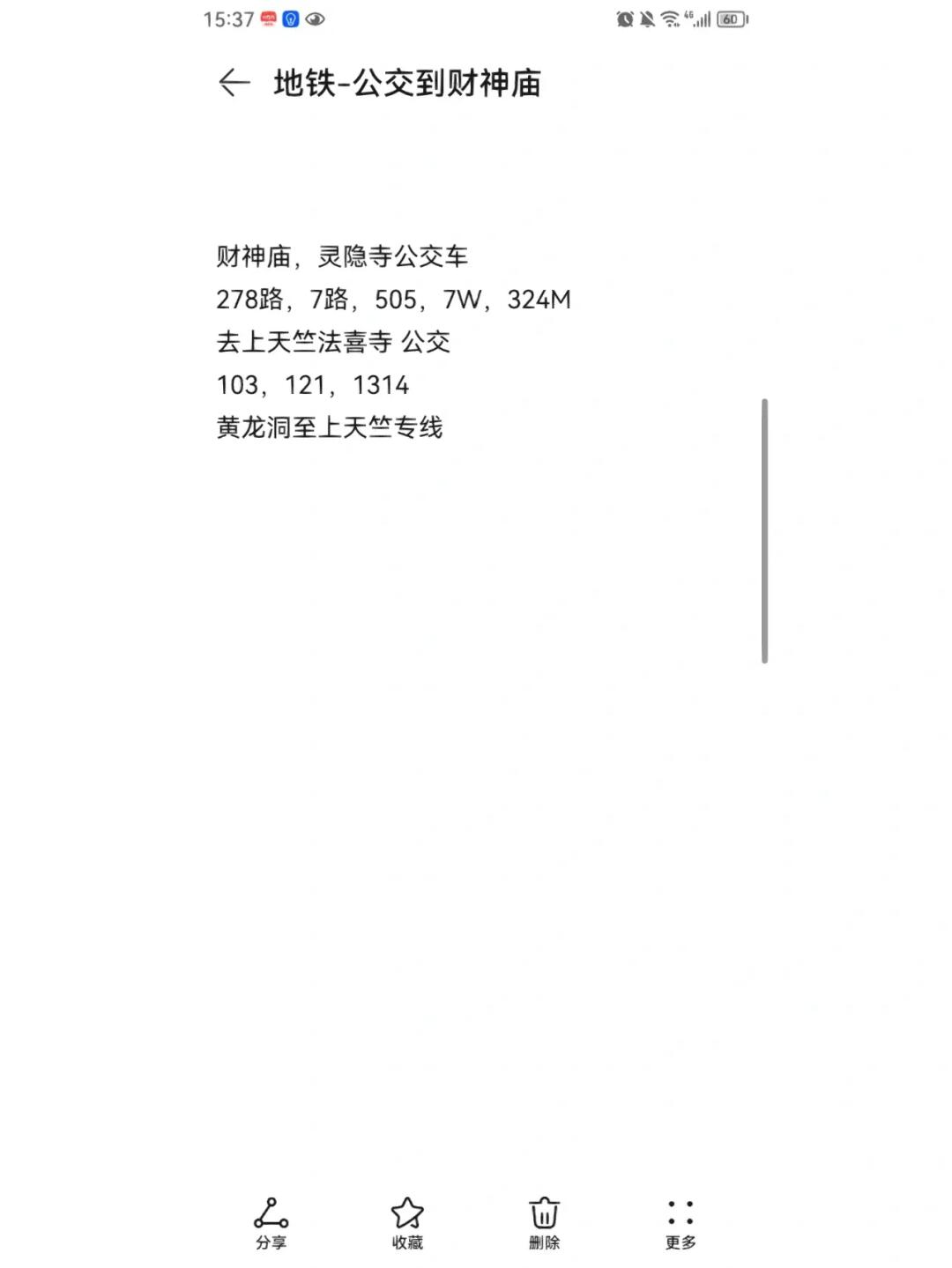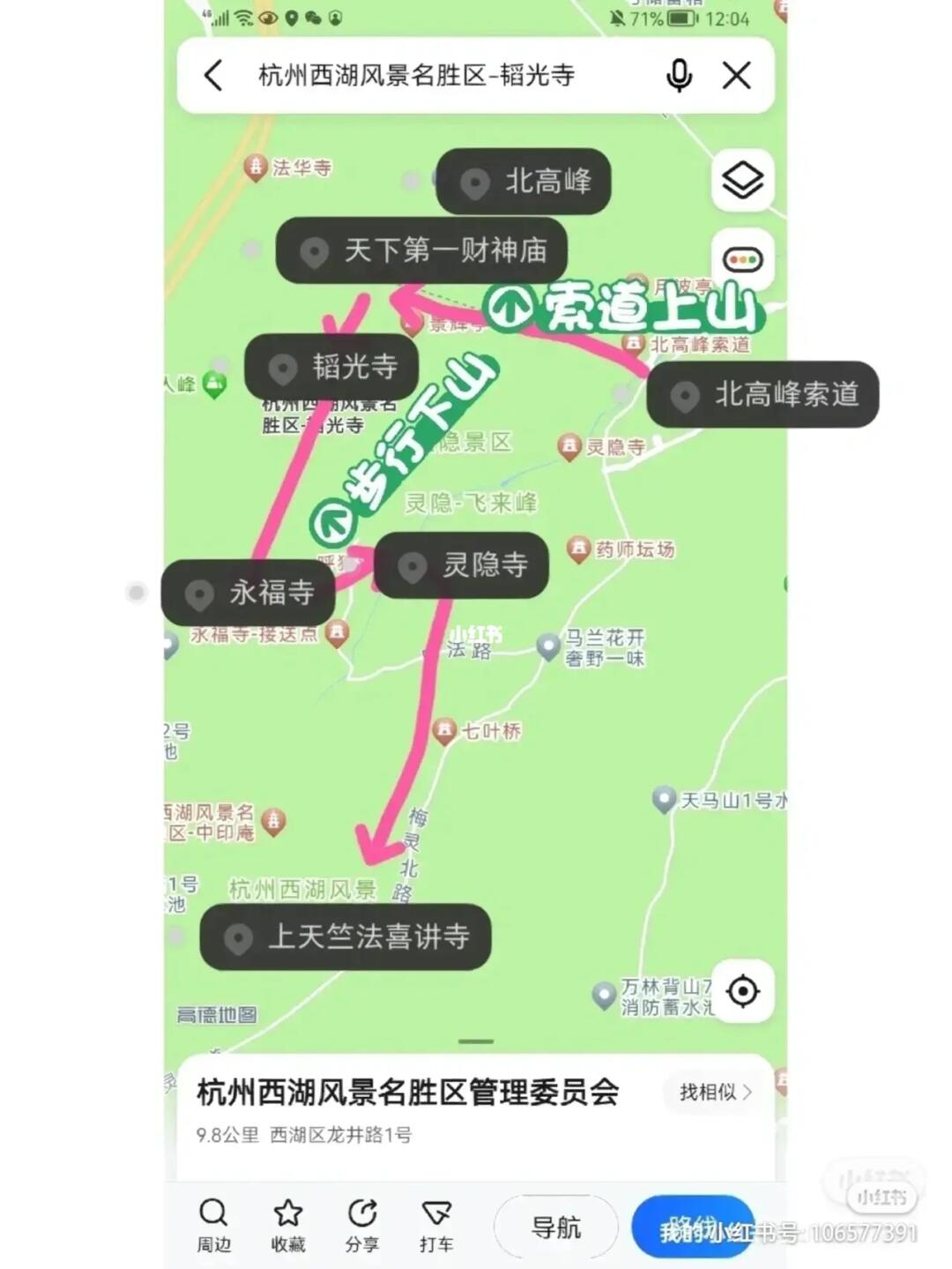 坐车到北高峰索道处-缆车上山(步行上山50分钟左右)-财神庙-步行下山-韬光寺-永福寺-灵隐寺-法喜寺