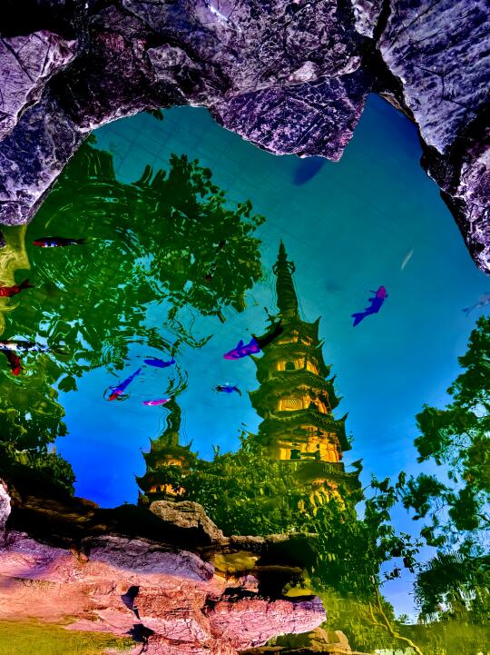 在【吴作人艺术馆】的小池塘可拍到双塔大鱼海棠倒影