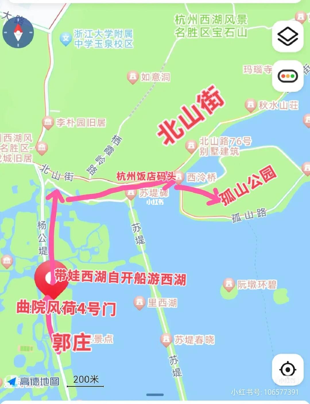 2[打卡R]4号门进来往右边走就是郭庄,4号门右边走还有个西湖环湖线的公交站牌,从这里可以花6元坐船去上香古道茅家埠(另外一篇笔记有介绍)