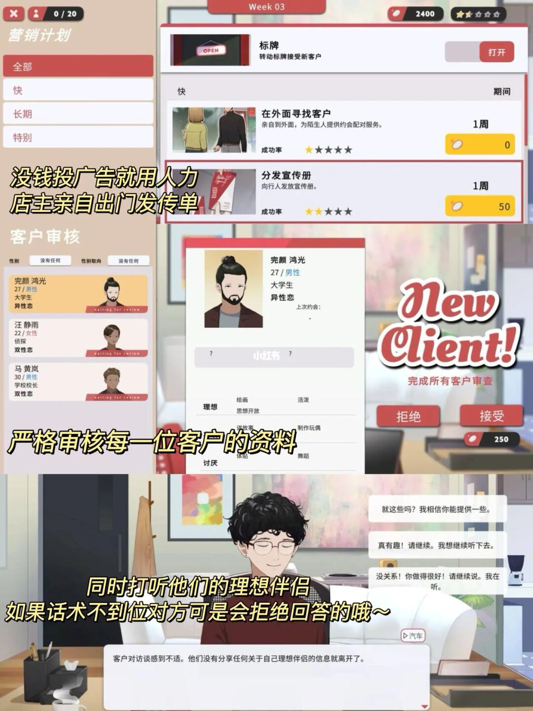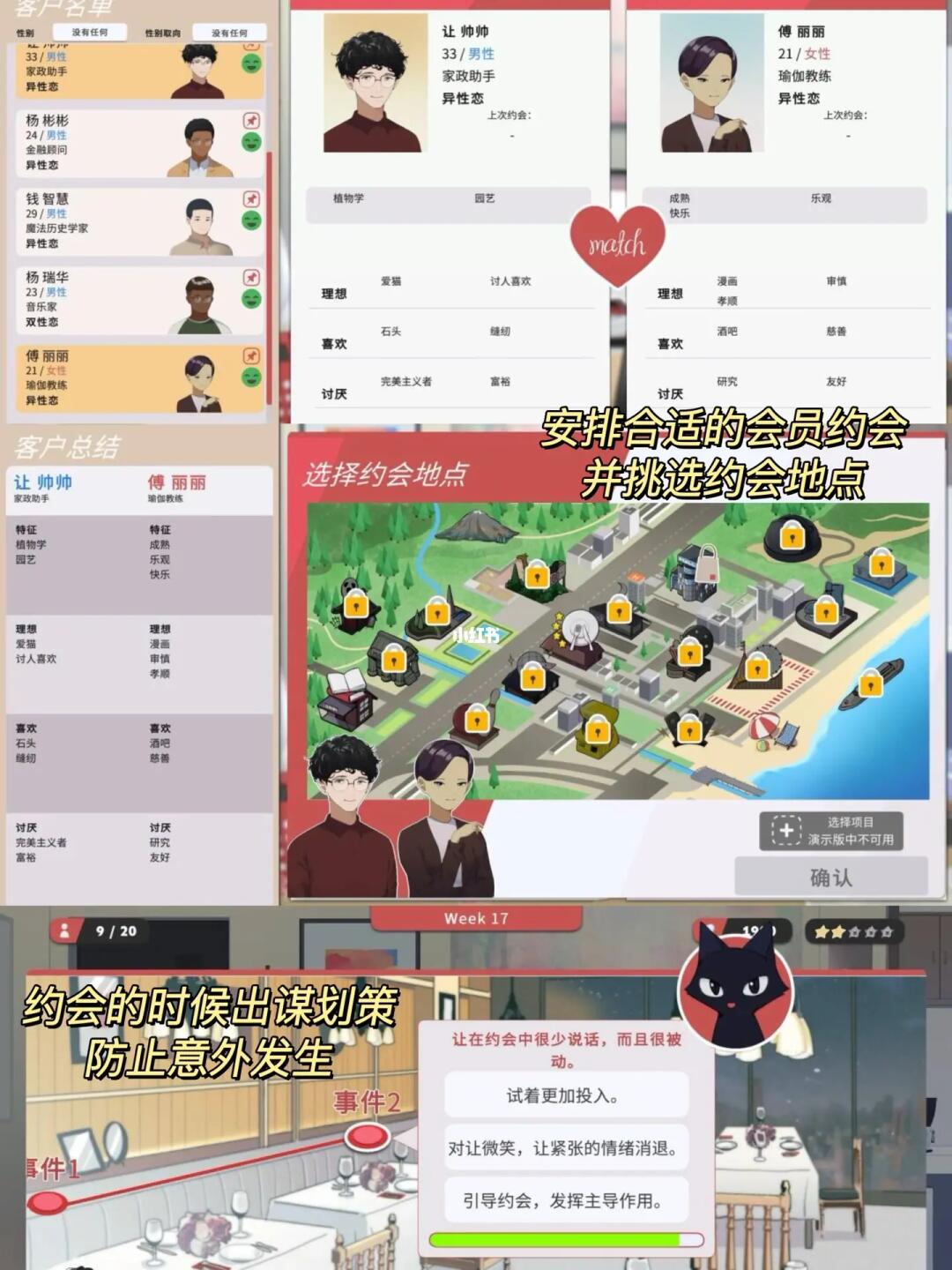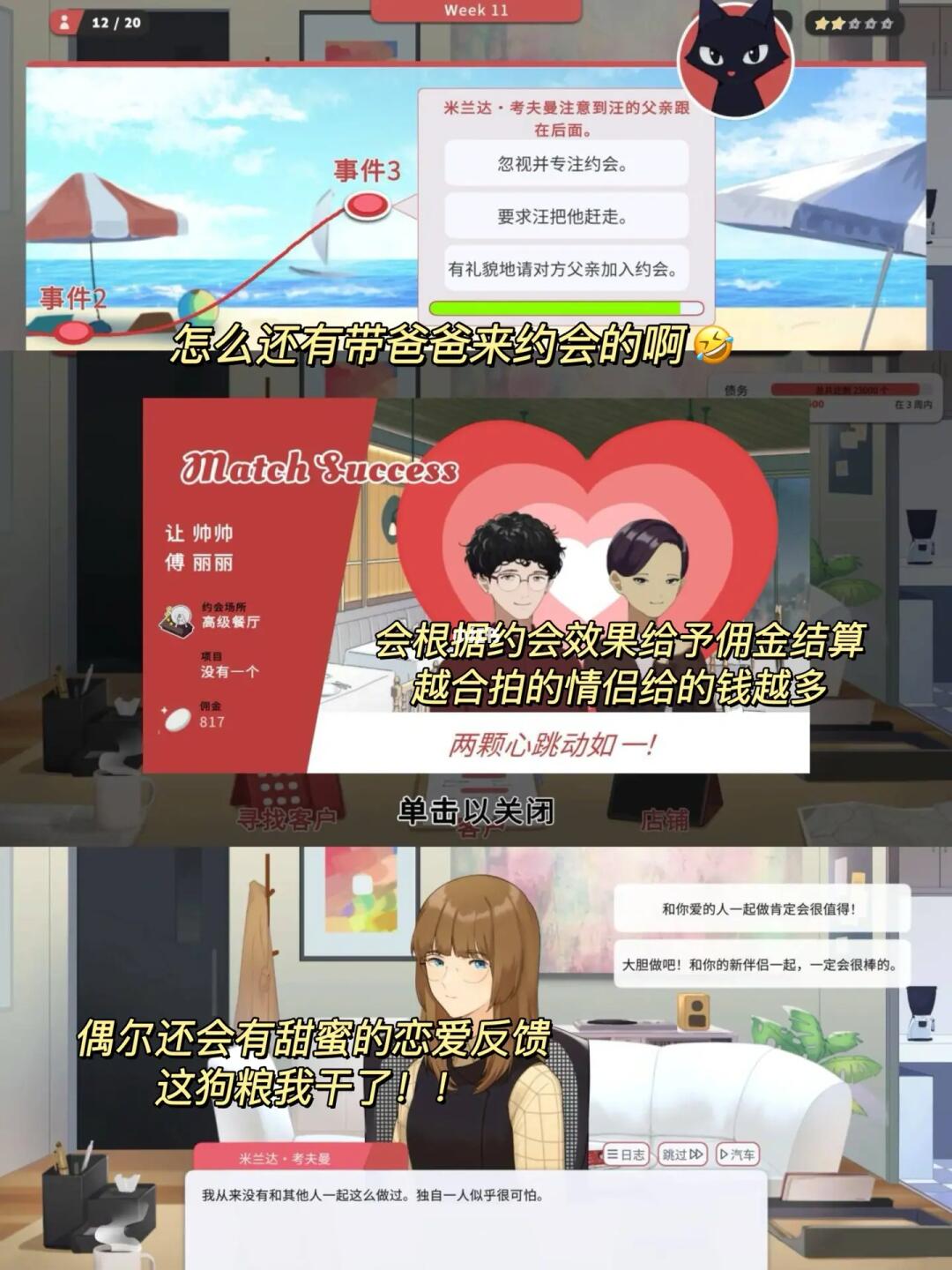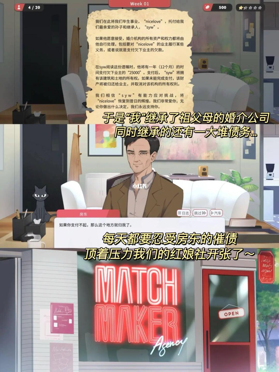 游戏名:《红娘社》 平台: Steam 游戏简介🎮: - 毕业后你继承了家里的婚介所 同时也继承了一大笔的债务 为了生存下去 你必须把婚介所经营起来… 游戏优缺点🎨: - ✔️超有意思的相亲式模拟经营类游戏 ✔任意搭配你认为的天生一对 ✔可以为插手约会并影响结果 ✔️有免费的试玩demo ❌游戏中文是机翻,略生硬 游戏评价📝: - 野心很大的一款游戏,制作组的布局很广,正式版似乎还可以攻略你的客户,但是由于demo的中文是机翻,经常词不达意影响体验,不过瑕不掩瑜,可以期待一波正式版~