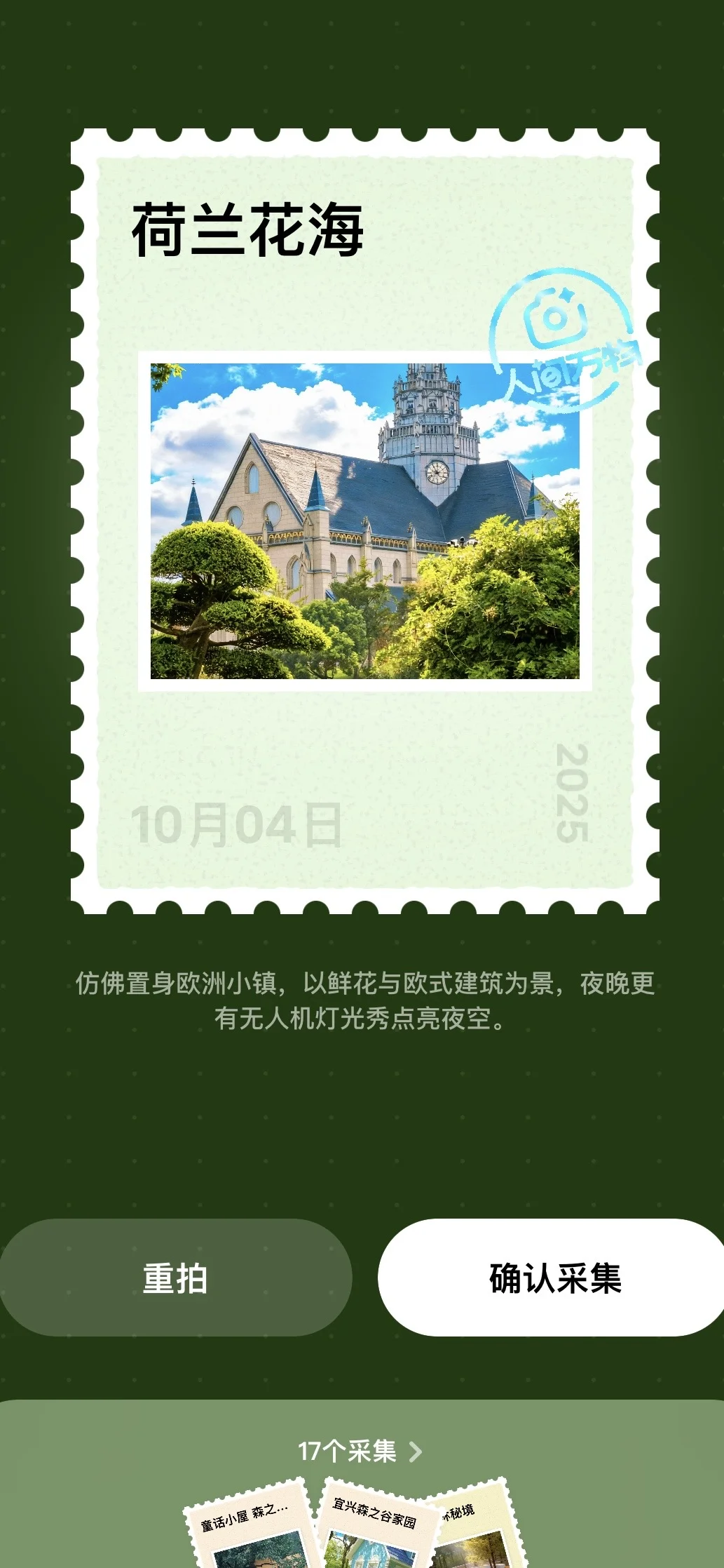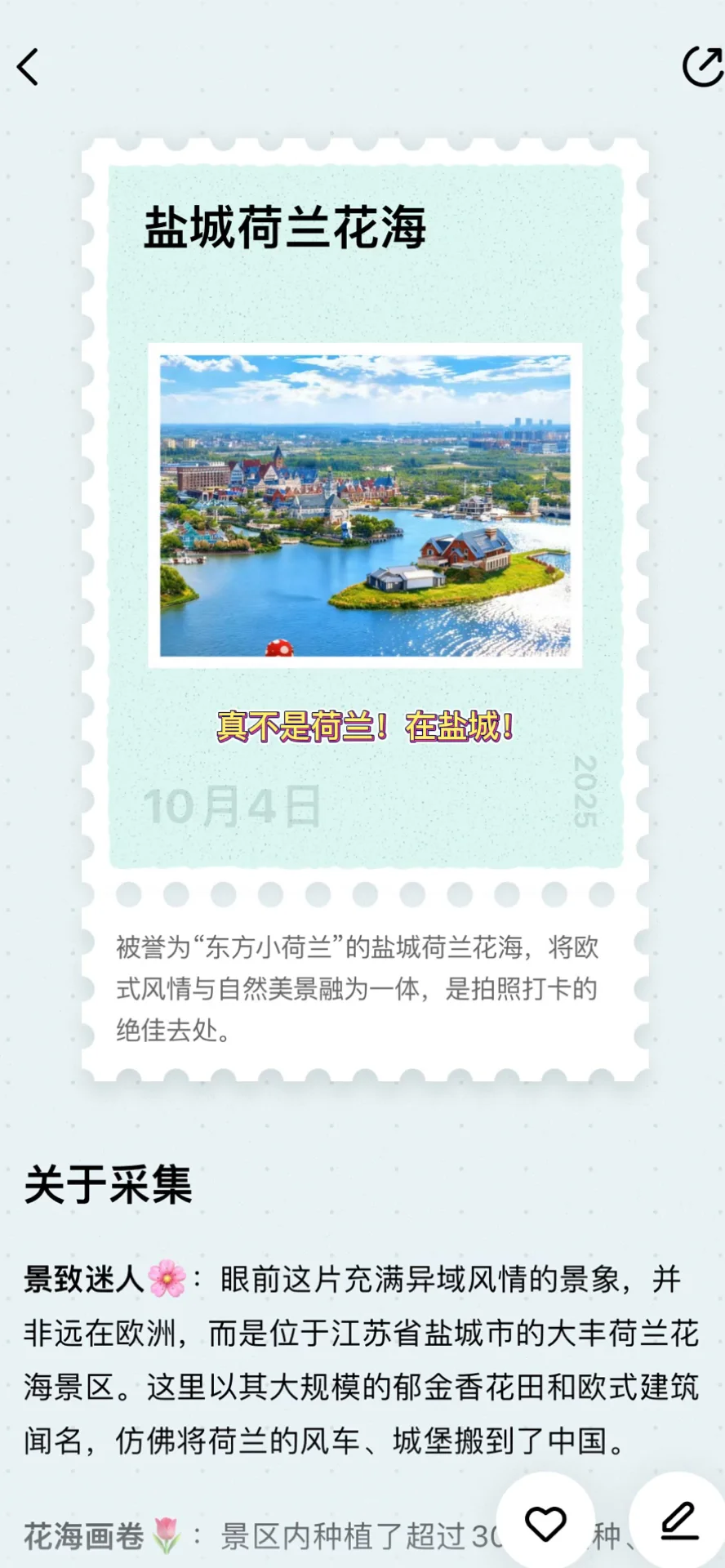 对啦,在盐城我用圆周旅迹新出的采集各种美景,还会解读名称呢,说不定还能收到镭射卡,看我收到的荷兰花海小卡,很有成就感!