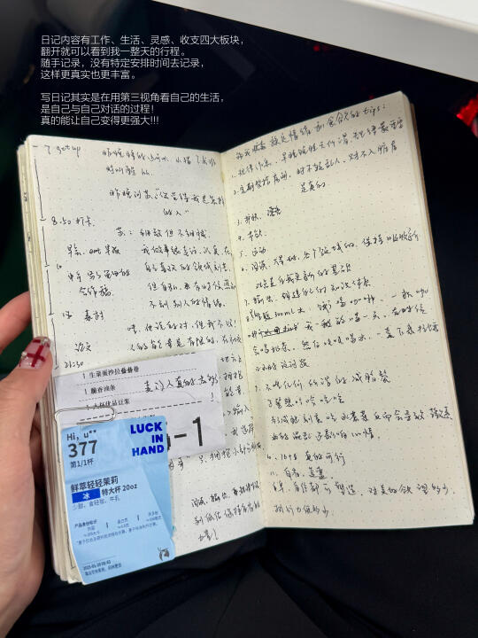 日记内容有工作、生活、灵感、收支四大板块,翻开就可以看到我一整天的行程。随手记录,没有特定安排时间去记录,这样更真实也更丰富。