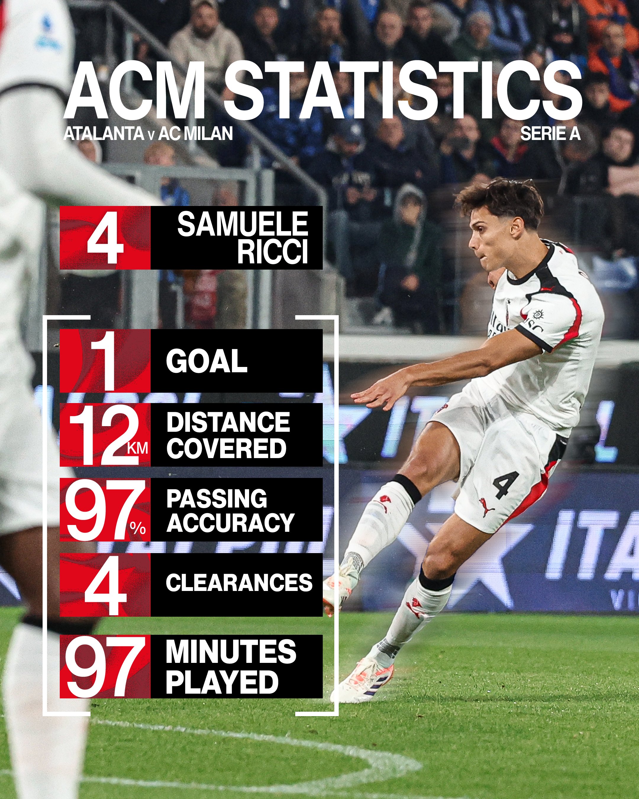 虎扑10月29日讯意甲第9轮,亚特兰大1-1AC米兰,里奇破门。赛后AC米兰官方晒出本场里奇数据: