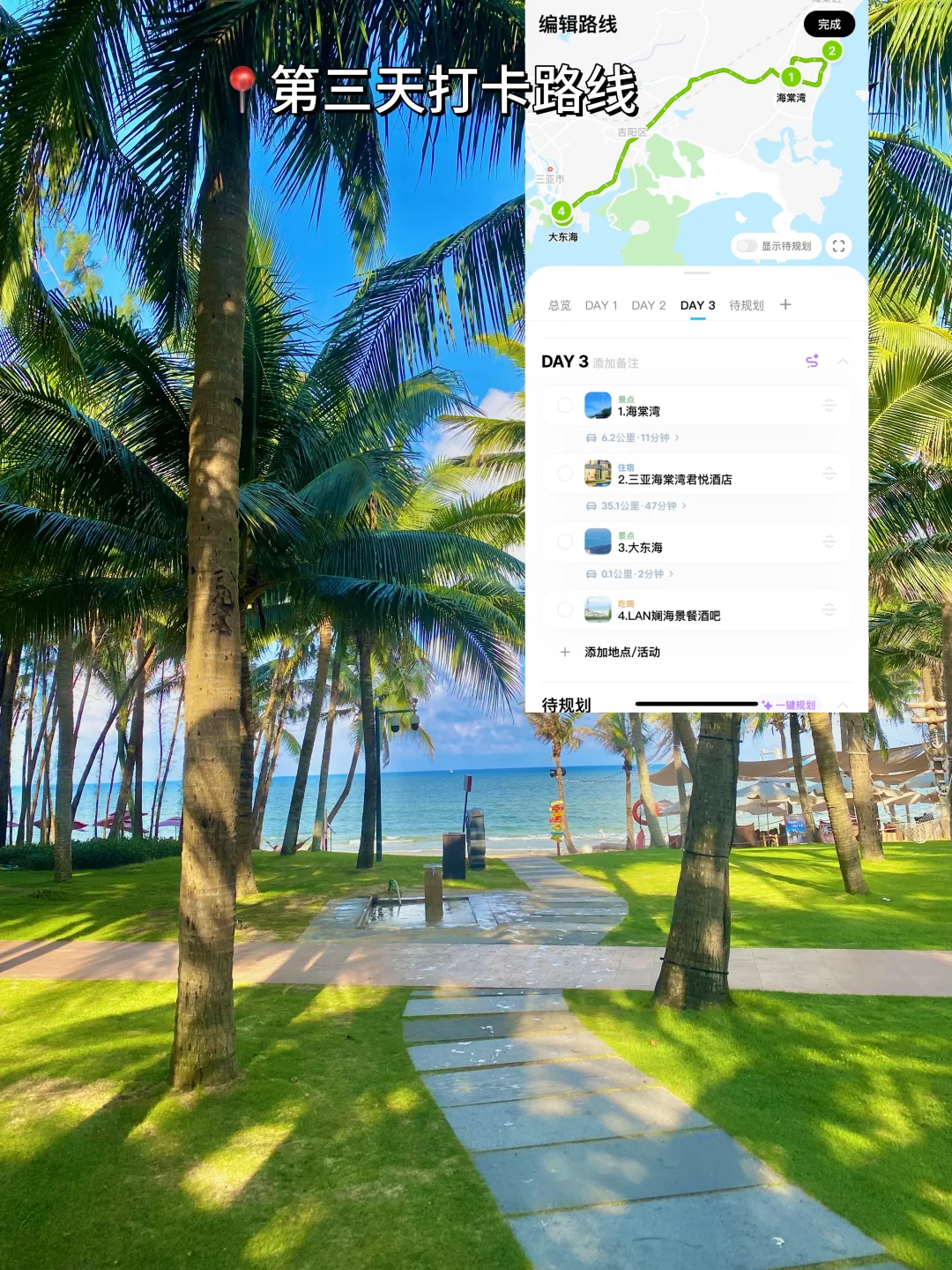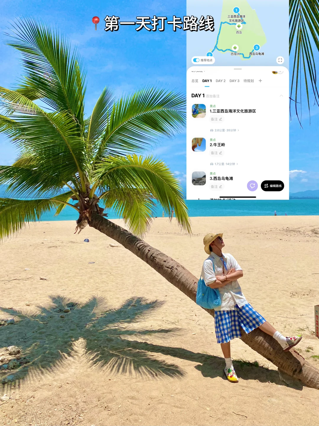 三亚三天两晚的详细吃喝拍照攻略! 最近要去的家人们码住了! 每次旅游前都习惯在圆周旅迹做好打卡路线📍 能对话智AI生成路线规划,很方便✔️ 每个景点都有详细介绍 Day1️⃣:西岛一日游p2-p5 珊瑚墙~牛王岭路上的路牌~西岛路牌~往前走一点的木牌子~天涯秘境打卡西岛2字~码头的彩色鱼~西岛爱心墙~海边孤独树~旁边的船~码头右边的歪脖子椰子树(可以租个小电驴更方便!30一整天记得要砍🔪价💰记得不要乱停车~) Day2️⃣: ✔️天涯小镇p6-p9 蓝洞咖啡~海边楼梯~~海里里咖啡~双子座~旁边的楼梯 (都是走路就可以到的地方,拍照的地方离得很近,可以慢慢逛 ✔️椰梦长廊p10 导航到海韵度假酒店 对面一条路都很好出片~ 6点多开始落日很有氛围感 Day3️⃣: ✔️海棠湾p11-p14 海棠湾君悦的公用海滩,拍照很好看,人少又出片,很多好看的打卡点 大东海 ✔️大东海p15-p16 很适合留一下午逛逛拍拍,很多好看的咖啡厅,沙滩也很干净 🥗美食推荐: 👍第一天虎婆香草鸭!(很嫩的鸭肉!还有香草清香的味道!芒果冰和椰子冰也好好吃!) 👍嗲嗲的椰子鸡(来海南一定会吃的椰子鸡!本地椰子🥥作汤底就是很鲜甜!记得先喝汤再吃肉~) 👍87号渔船海鲜(特别喜欢烤虾和炒螃蟹!都是先抓的很新鲜!现炒的炒冰很好吃) 👍 太琼糟粕醋 (很爱吃酸酸的糟粕醋搭配海鲜!炒饭也好吃)