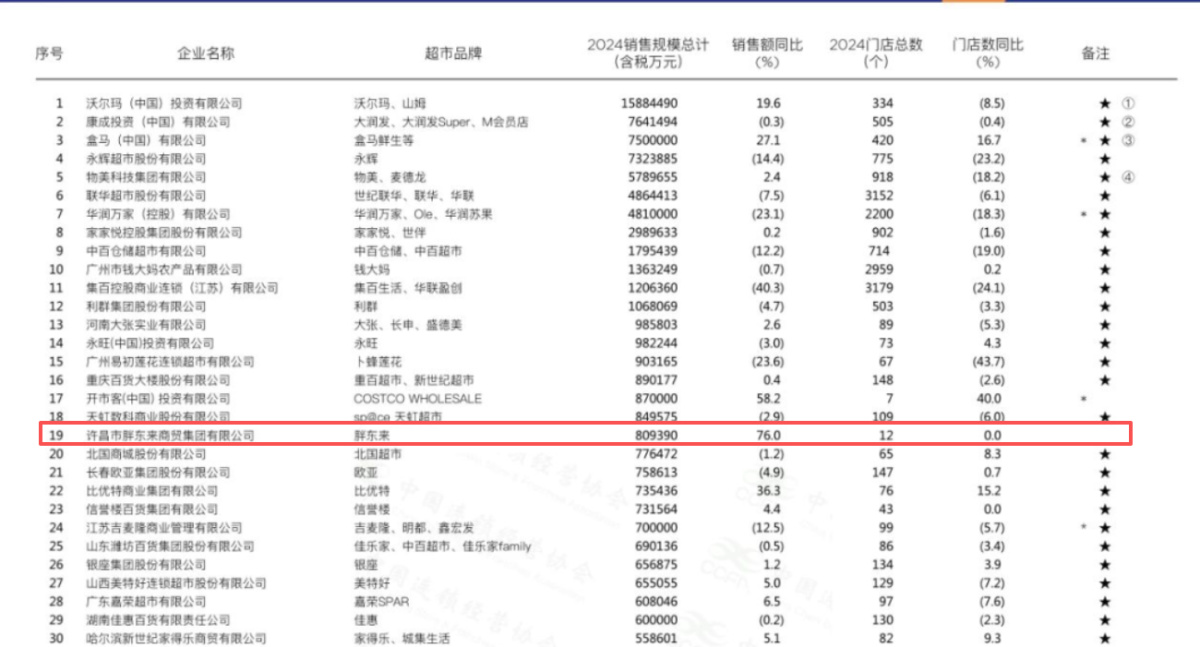 在行业排名中,这一成绩同样具备竞争力。根据中国连锁经营协会(CCFA)公布的“2024年中国超市TOP100”榜单,2024年胖东来超市板块以80.93亿销售额位列第19位,较2023年的第31位上升了12位;而2025年截至目前的109.1亿元的成绩,已能跻身2024年榜单的第13名。