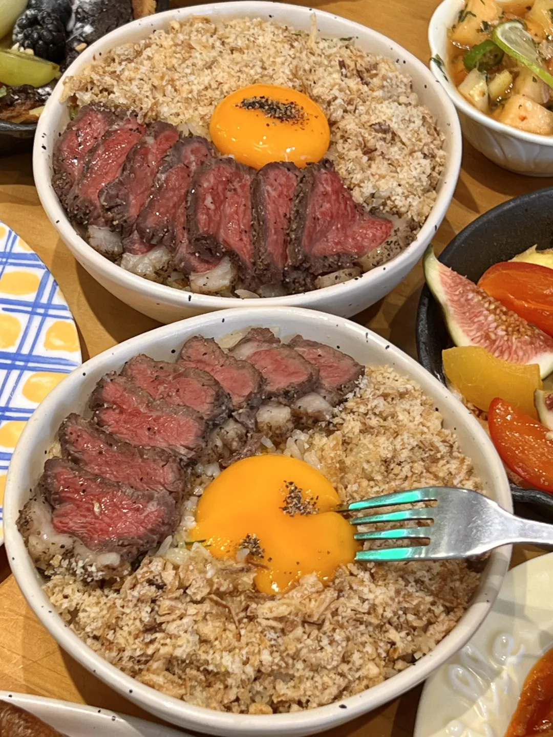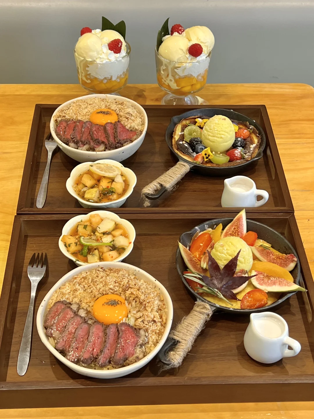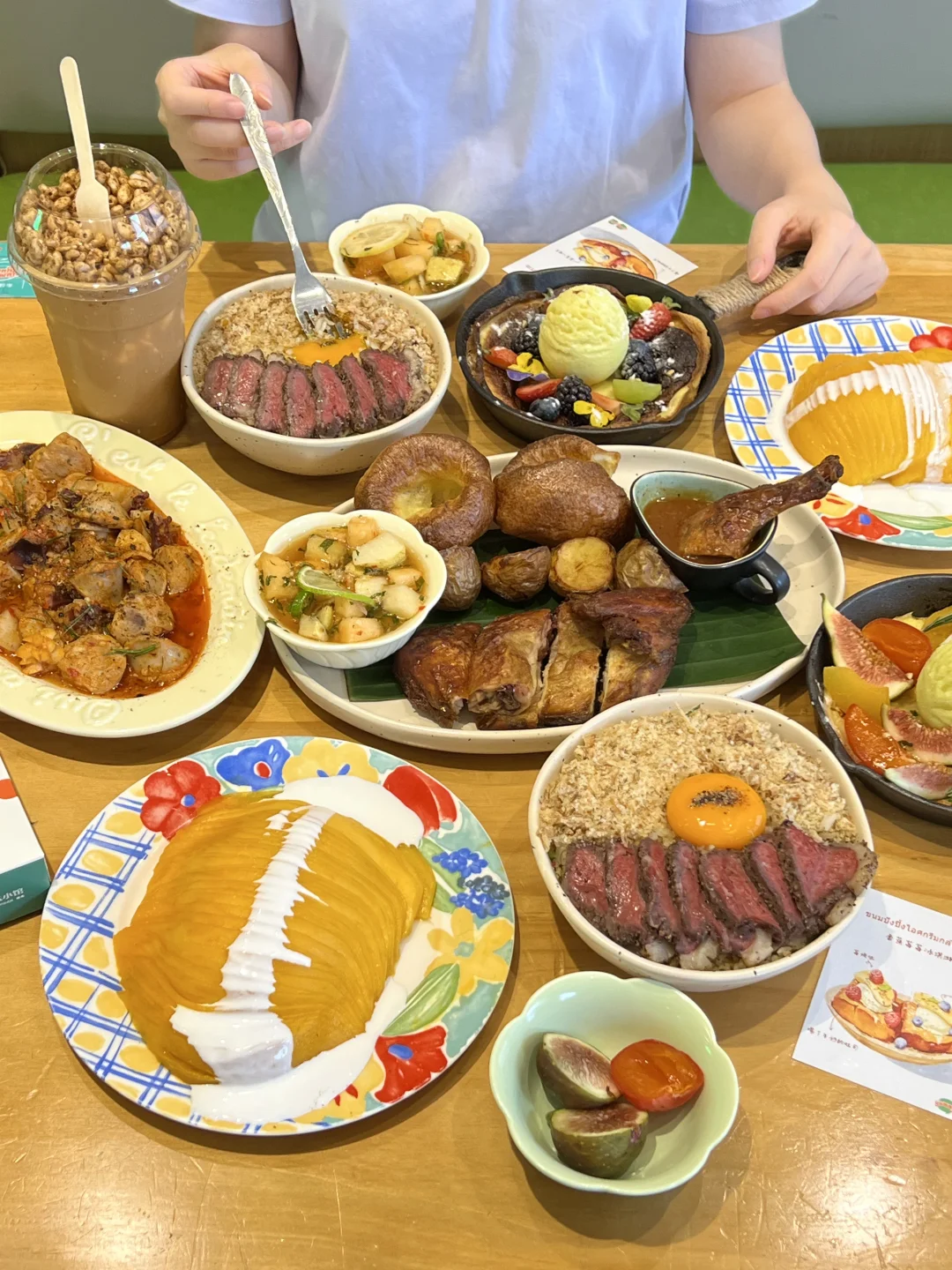 曼谷落日烤牛肉炒饭!!!真的hin满意!!牛肉很嫩,底下的炒饭会略干一点!!口味不会很重!感觉减脂期的姐妹也能吃!!! 读大学就开始吃的一家小店,老板很注重菜品的研究,每次过来都会给人惊喜!!很适合一人食或者和小姐妹聚会,价格也不贵很实在!!! 喜欢小甜甜的姐妹一定要试试他们家现烤的颜值巨高的松饼,两种口味都好好吃!!配上他们家的麦粒豆花泰奶冰!!太满足惹!!📍yummy yum泰味小馆