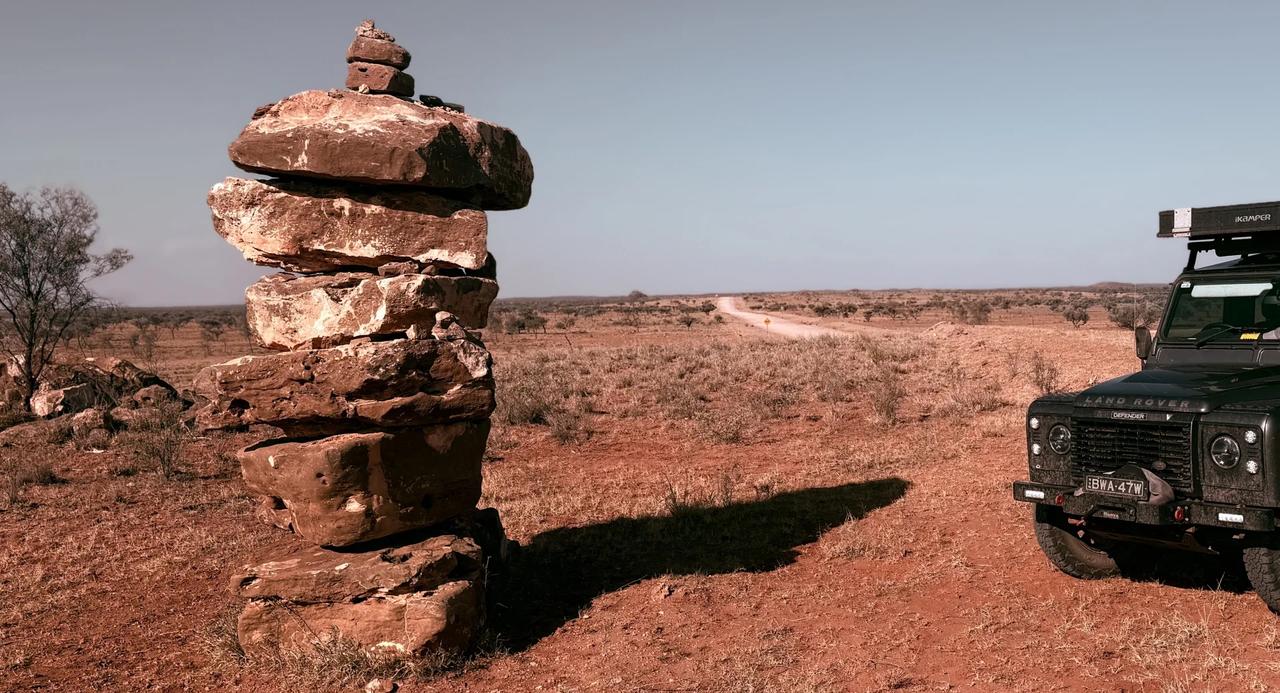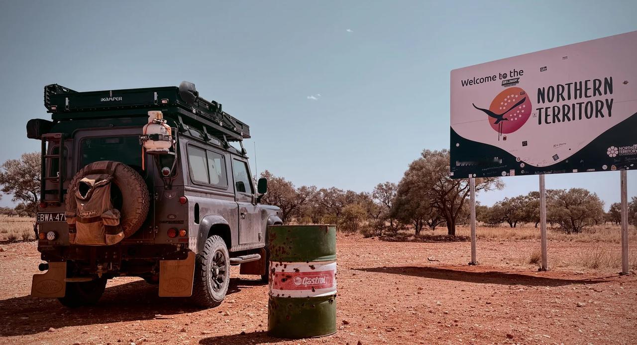 环澳自驾|D105 内陆系列⑦【踏入北领地】 踏入北领地界碑,继续深入无人区。这一天的400公里,只与一辆车擦肩而过,竟也是老卫士。 环澳自驾 环澳旅行 路虎卫士 老卫士 越野 4wd 澳洲内陆探险 澳洲内陆 outback