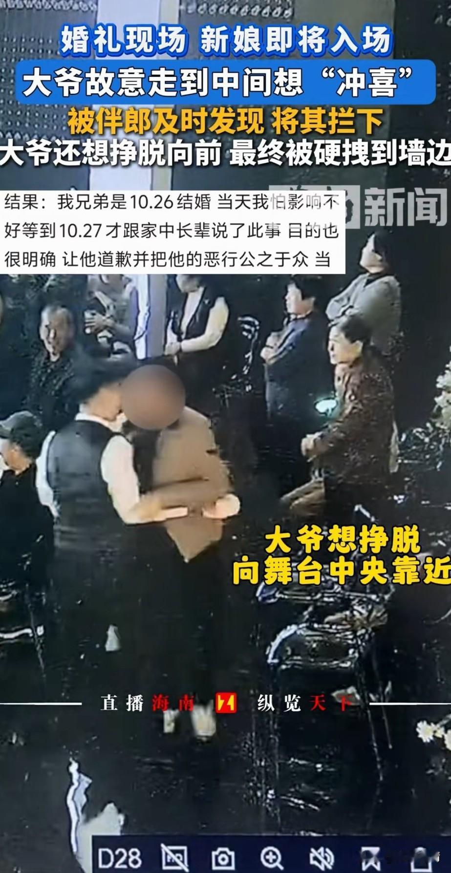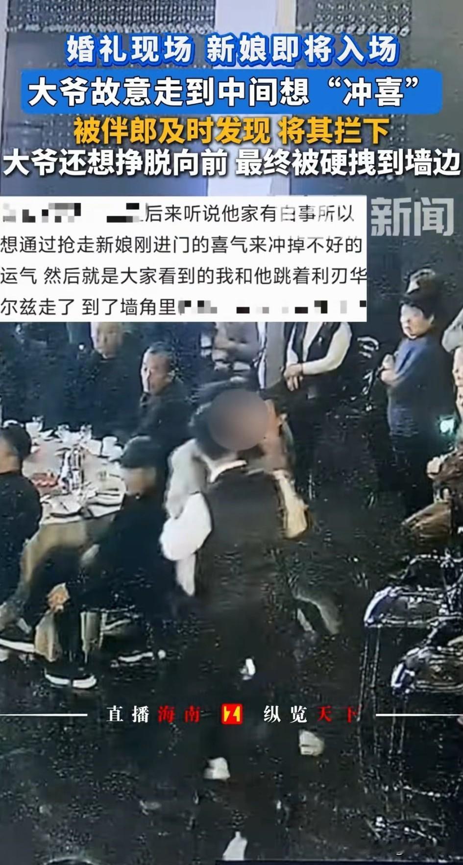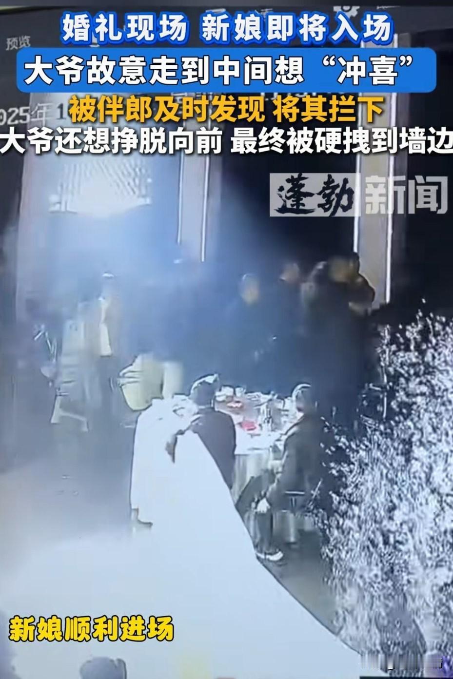 近日山东济南婚礼现场大爷行为惹争议,当时新娘马上就要出场了,坐在旁边的大爷突然站起身来,走向舞台过道,被旁边的伴郎及时发现。 抱着大爷的双手,两人跳起了几秒利刃华尔兹。伴郎将挣扎的大爷推回了到了旁边的位置。原来大爷是想抢走新娘进门的喜气,给自己家冲冲喜。 被旁边的伴郎及时发现,强行阻止了。事后才知道大爷家刚过了白事,她就是想抢了新娘的喜气给自己家转转运。新郎知道后不想影响当天的婚礼,没有说什么。 第二天后将这种事情告诉了自己家的长辈,并将视频公之于众,目的很明确,就是希望大爷能够公开赔礼道歉。大家对于济南大爷婚礼现场抢新娘进门喜气给自己家冲喜怎么看? 济南身边事 那些厉害的大爷 你见过婚礼上的“抢福冲喜”行为吗 大爷婚礼现场 济南跳舞大爷 济南结婚婚纱
