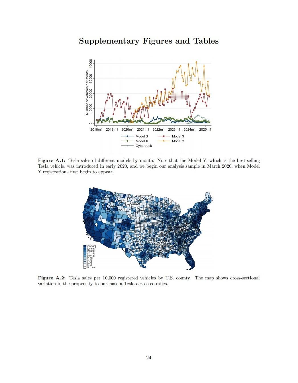 * 研究的主模型假设马斯克的行为对共和党买家的影响接近于零(\Delta\phi_t^R \approx 0),因为民调显示共和党人对EV的兴趣普遍较低,且马斯克的形象并没有增加共和党人购买特斯拉的意愿。