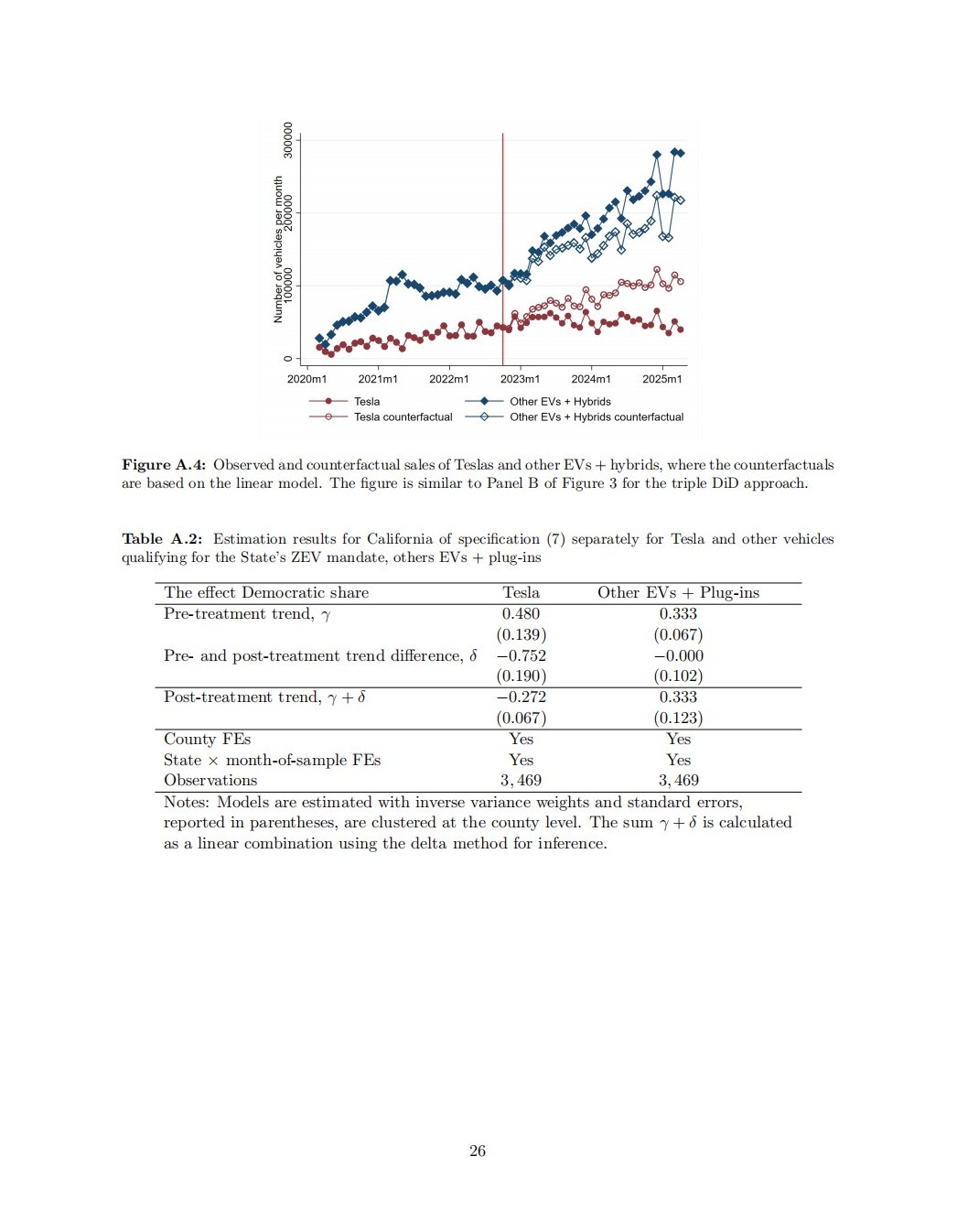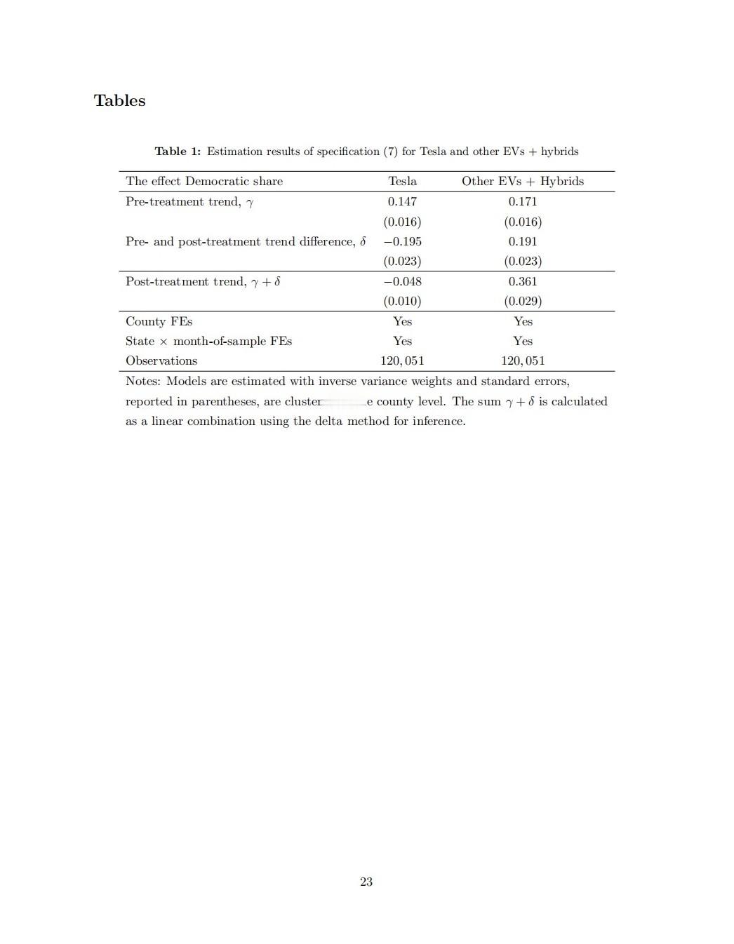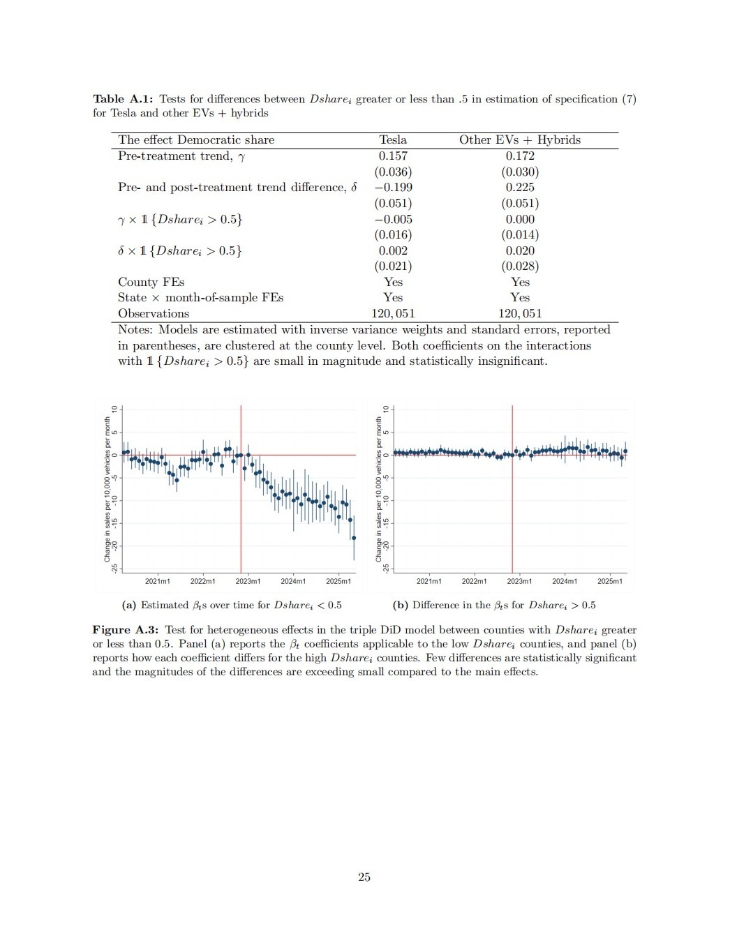 * 这是研究的主要策略。它同时比较 (1) 2022年10月前后、(2) 不同党派倾向的郡县、(3) 特斯拉销量与“其他EV+混动车”销量之间的差异。