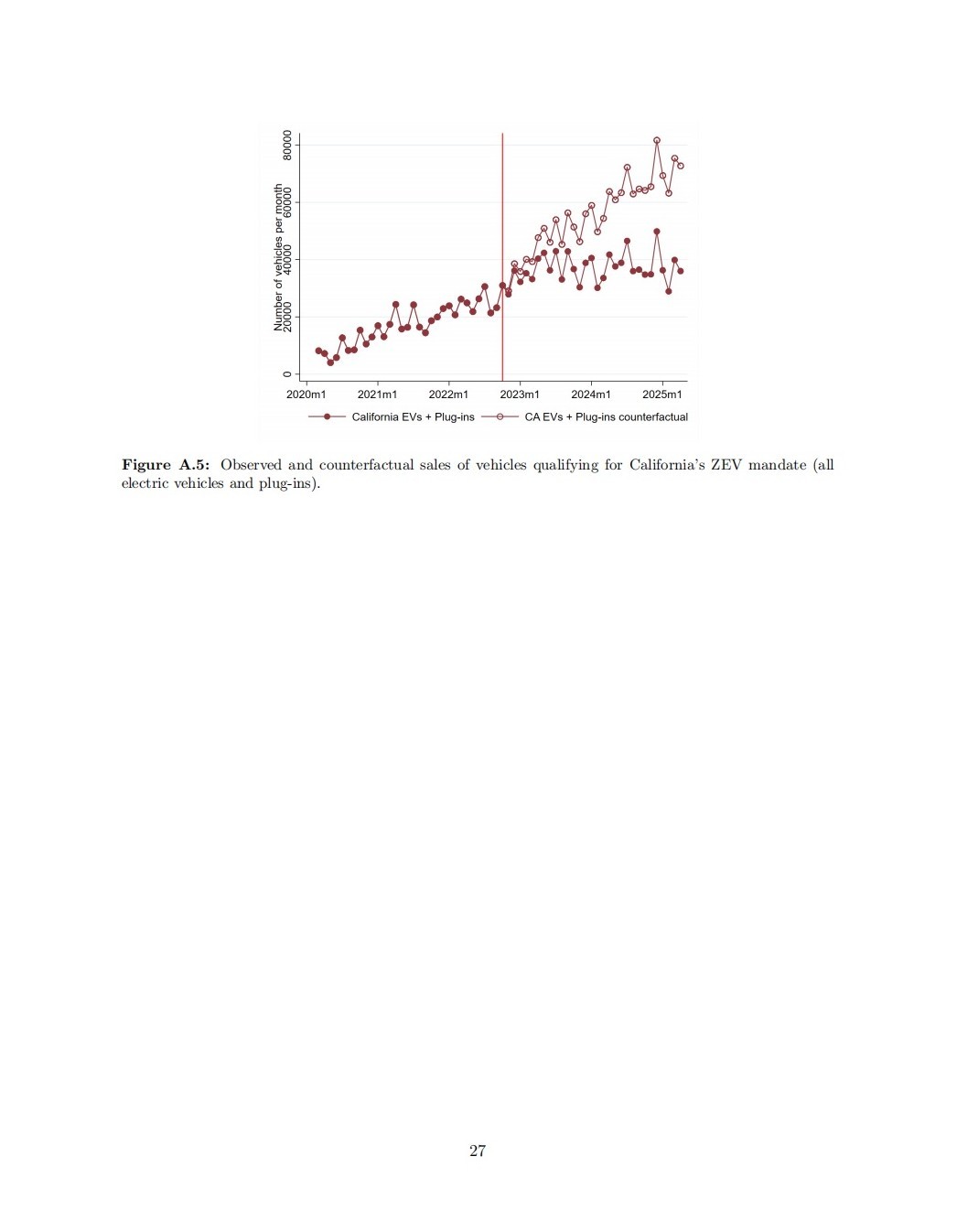 * 关键区别:但在加州,这些损失的销量没有转向其他符合ZEV标准的EV或插电混动车(替代效应可忽略不计)。这意味着消费者可能转向了传统混动车或其他不符合ZEV标准的车辆。