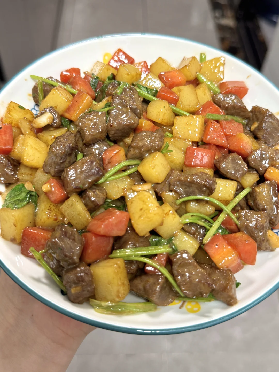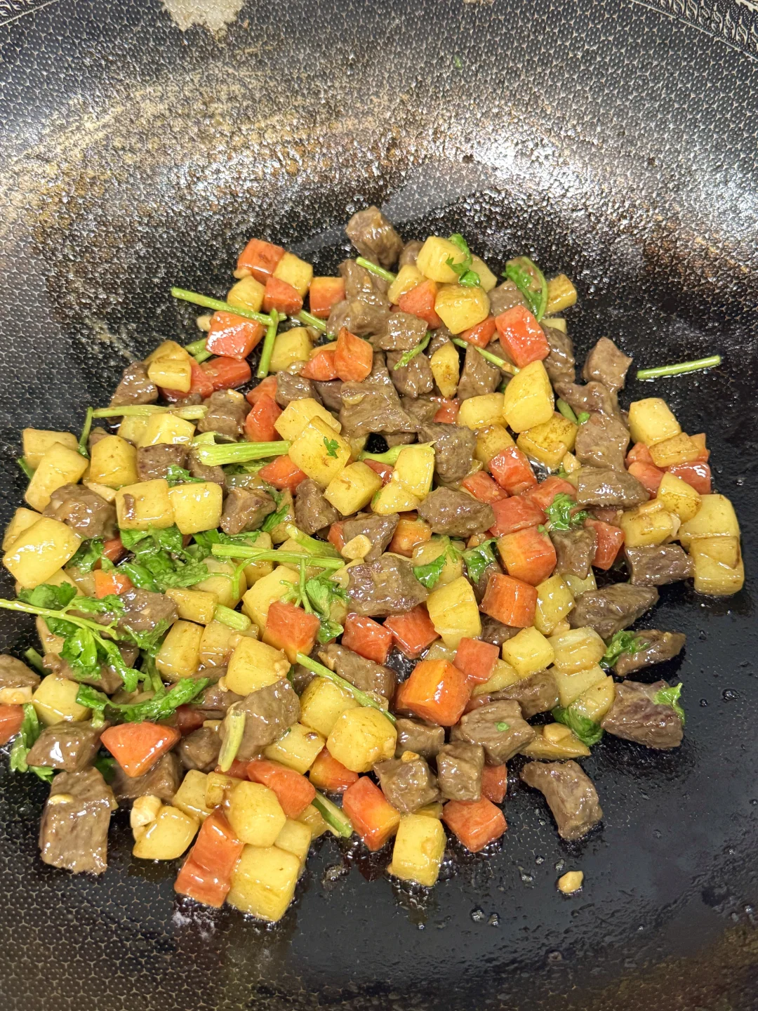 [彩虹R][彩虹R][彩虹R]今天又做了一道下饭神器![害羞R]没吃过的一定要试试,香哭了,[赞R][赞R]一道菜干了三碗米饭~ 食材:牛肉、土豆、胡萝卜、蒜末、香菜 做法: 1️⃣牛肉切丁,加半勺老抽、一勺生抽、半勺淀粉、一勺食用油腌制20分钟 2️⃣油热下牛肉丁、蒜末爆香,再放入胡萝卜煎3分钟左右捞出备用 3️⃣锅留底油,加一勺盐,加入土豆丁煎至两面金黄,倒入牛肉胡萝卜翻炒均匀 4️⃣加入半勺鸡精翻炒均匀,出锅撒上香菜即可一定要试试,很简单又下饭~