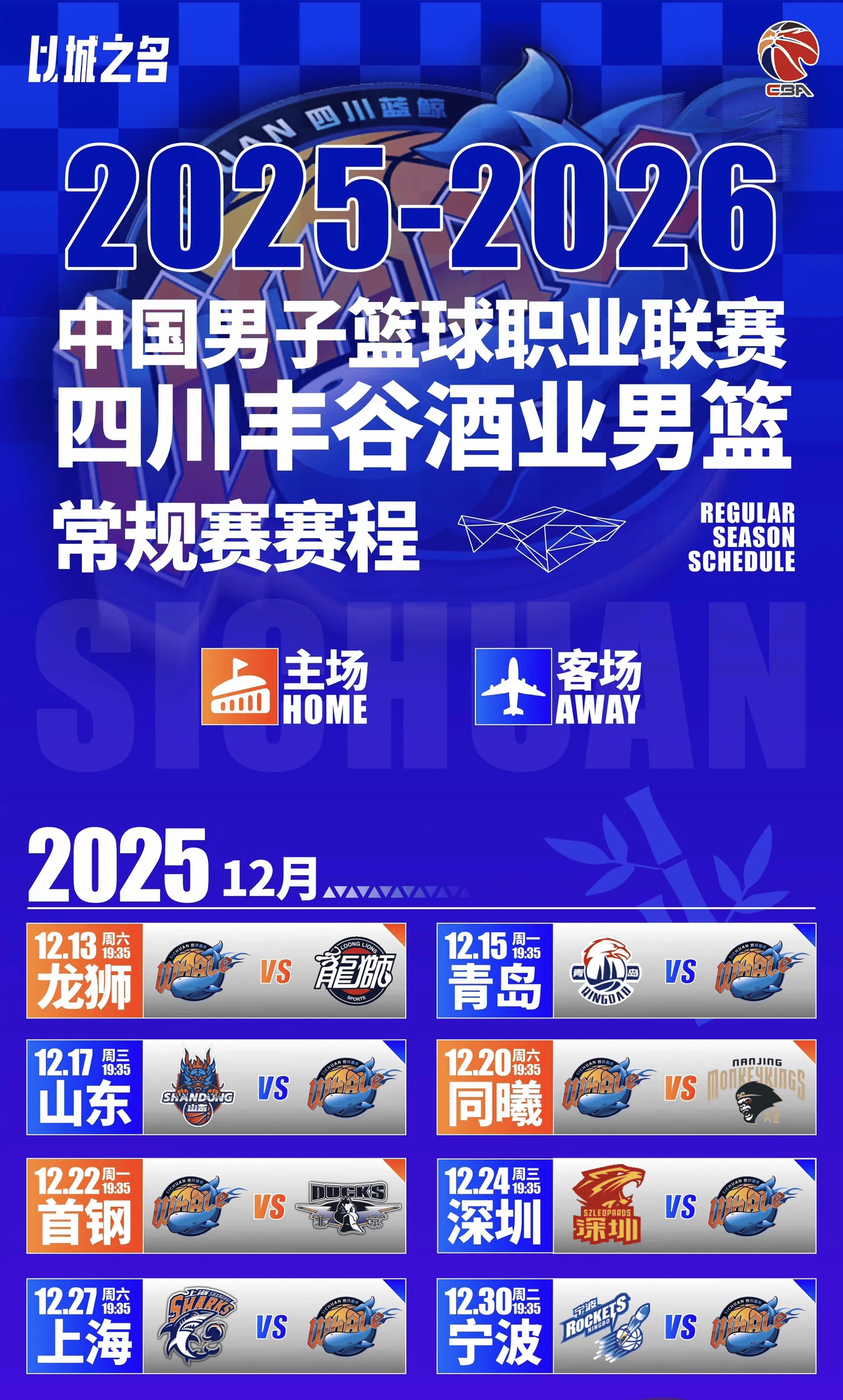 虎扑10月29日讯四川男篮社媒分享新赛季赛程:揭幕战将迎战广州男篮。
