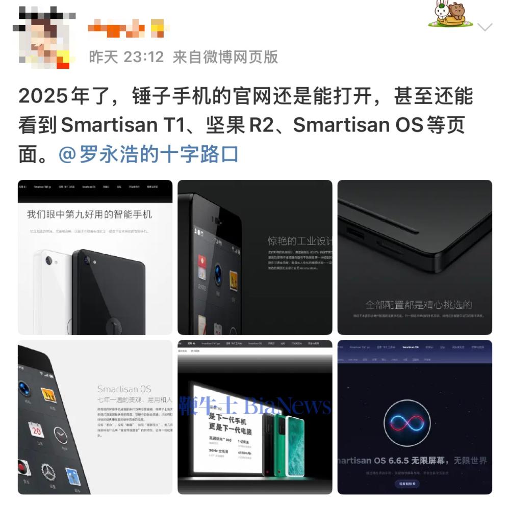 该博主发文称,“2025年了,锤子手机的官网还是能打开,甚至还能看到SmartisanT1、坚果R2、SmartisanOS等页面。”并@罗永浩社交账号。