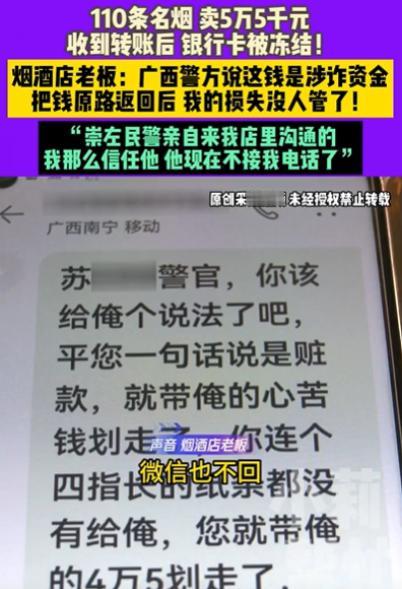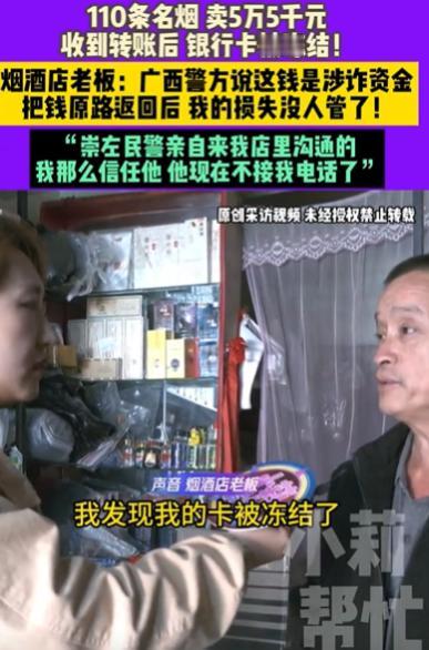 河南,3名男子去买烟,张口就要110条烟,总计5.5万元!店主以为来了大客户,热情接待对方,结果,没过多久,店主的银行卡就被冻结了!原来,他们收到的烟钱,居然是涉诈资金!被广西警方冻结,现在不仅烟没了,连钱也没了,店主两口子非常委屈,夫妻俩面对媒体伤心流泪! “小商户怎么分辨钱是赃款?” 最近河南洛阳烟店老板张建军的遭遇,让网友围绕这个问题争论不休。 张建军的烟酒店在洛阳老城区,这次他不仅没赚到钱,还赔了五万五,连店铺运营都成了难题。 事情发生在中秋前半个月,三个穿西装的男人走进张建军的店,说要一百一十条高档烟给员工发福利,算下来总共五万五。 张建军开店八年,最多一次只卖过二十几条烟,这笔生意让他很惊喜。 对方付款很爽快,给了一万现金,剩下的四万五用手机转了账,张建军当时还想着用这笔钱进些新货。 可转账才两天,张建军去银行取钱进货时,发现银行卡被冻结了。 他换了三家银行询问,工作人员都只说银行卡涉及涉案资金,具体情况要等警方通知。 这一等就是二十天,店里的烟卖一条少一条,进货的钱没着落,张建军和妻子都急得不行。 后来广西崇左的苏警官带着公文来到店里,告诉张建军那四万五是诈骗得来的涉诈资金,必须原路退还给受害人,不然银行卡会一直冻结。 苏警官还承诺,退钱后会帮忙追回那批烟,不会让张建军有损失。 张建军相信警察,当天就把四万五转了过去。 可转完钱后,苏警官就联系不上了,电话不接,微信也不回。 烟被拉走了,钱也退了,张建军夫妻俩没办法,只能在邻居的建议下找媒体求助。 他们每月要交三千五百块房租和水电费,现在连这笔钱都快凑不出来了。 这事被报道后,网友们纷纷讨论。 有开了二十二年烟酒店的同行说,自己有最高级的烟草证,陌生人一次买五十条以上烟的情况从来没遇到过,这种大额订单很可疑。 还有人提到去年河南新乡的事,当地一个农民卖小麦攒的二十八万被骗子骗走,最后钱也没追回来,大家都觉得骗子专挑老实人下手。 更多网友质疑,为什么涉诈资金不在骗子账户里冻结,非要转到商户手里才处理? 小商户根本没能力分辨钱的来源,总不能卖东西前先查顾客的资金吧? 还有人觉得,跨区域办案不能这样,商户配合退了钱,后续损失却没人管。 也有网友给出建议,说银行应该在大额陌生转账时,给收款方发个风险提示,让商户多留意。 还有人希望警方办案时,能给商户开个书面承诺,写清楚退钱后怎么追回损失,别退完钱就不管了。 张建军夫妻俩也没闲着,他们去当地烟草管理局反映情况,可工作人员说跨区域办案协调不了。 后来社区志愿者帮他们联系了街道办,申请到三万块的小额经营贷款,暂时缓解了房租压力。 现在张建军还和巷子里其他几家商户约定,遇到陌生顾客买大额商品,互相通个气,多问几句情况,要是对方不对劲就拒绝交易。 如今张建军的银行卡虽然解冻了,但那批烟和四万五的钱还是没追回来。 他用贷款进了一批中低档烟,每天从早上七点守到晚上十点。 熟客来买烟时,张建军总会提醒他们,遇到陌生人买大额东西一定要多留个心眼。 其实像张建军这样的商户还有不少,他们没参与诈骗,却要承担骗子带来的损失。 大家都觉得,打击诈骗不能只抓骗子、追赃款,也得考虑这些无辜商户的处境,要是能有专门的补偿机制或者维权通道,也不会让老实人寒心。 不然以后谁还愿意配合警方办案,谁还敢安心开小铺呢? 那么到最后,你们怎么看呢? 如果各位看官老爷们已经选择阅读了此文,麻烦您点一下关注,既方便您进行讨论和分享,又能给带来不一样的参与感,感谢各位看官老爷们的支持!