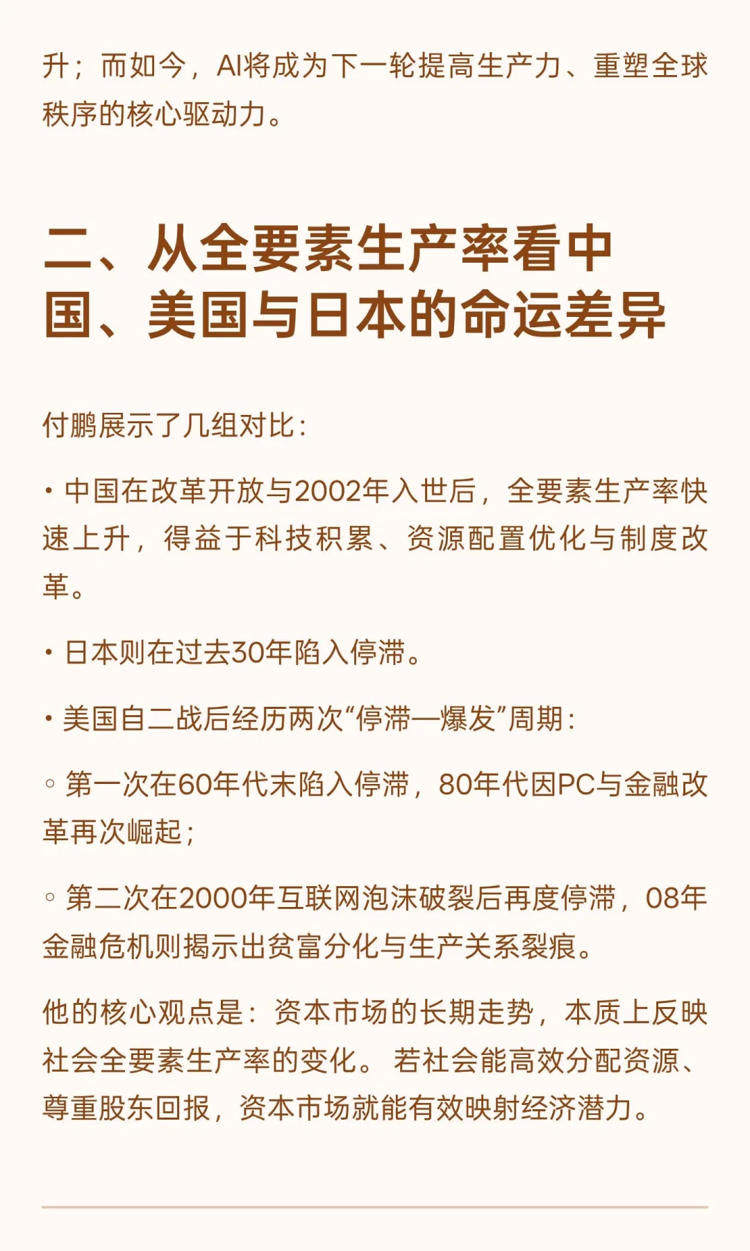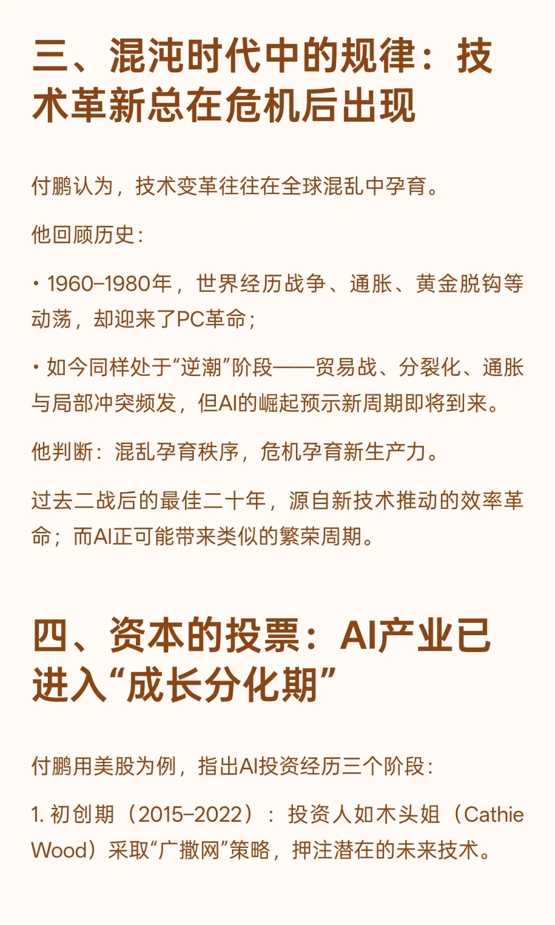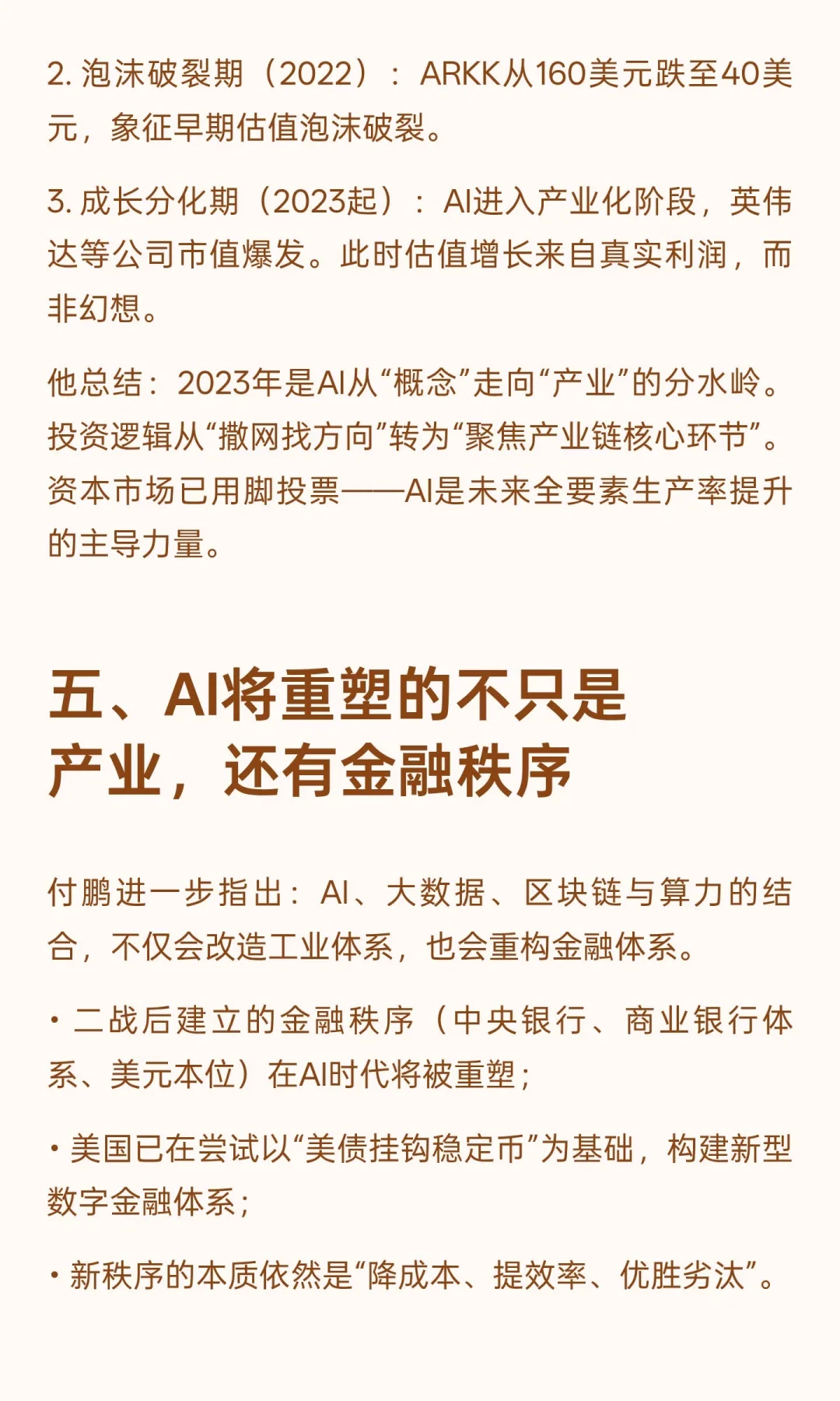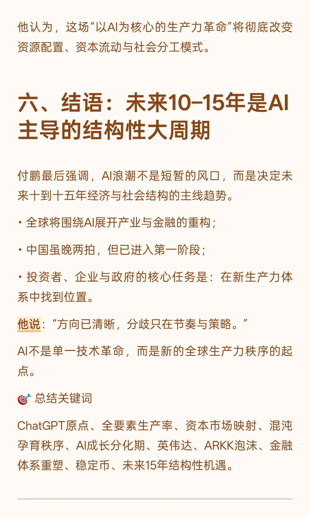 [向右R]付鹏10.6最新公开演讲,他在演讲中提出:2023年是AI时代的原点。从ChatGPT的出现到英伟达的爆发,人工智能正成为推动全球经济结构重塑的核心力量。 付鹏认为,未来10到15年将进入一个“AI驱动的超级周期”,它将像上世纪PC与互联网浪潮一样,全面提升生产力、重塑产业与金融秩序。 他强调,AI不仅是一项技术,更是决定未来财富分配的新生产力体系。当前虽然处于混沌阶段,但正是新秩序诞生的开端。未来的机会,将属于那些理解趋势、顺势布局的人。