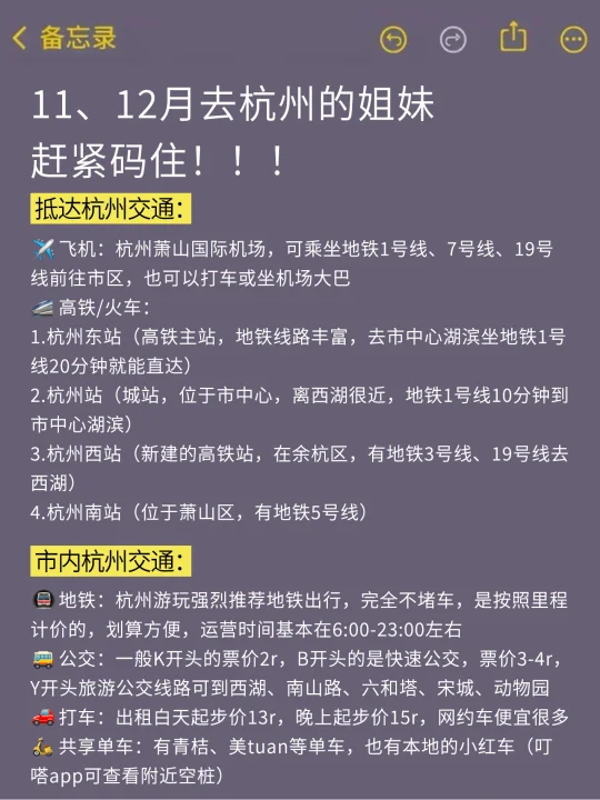 抵达:杭州东站(高铁主站)、杭州站(靠近市区和西湖)。机场有1号线直达西湖