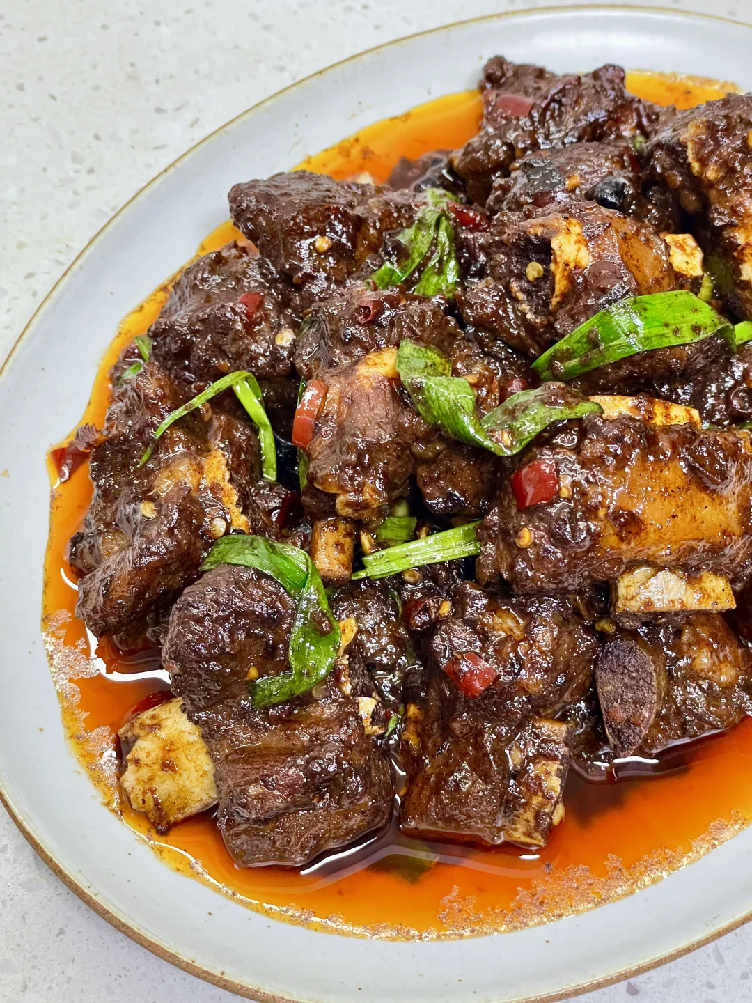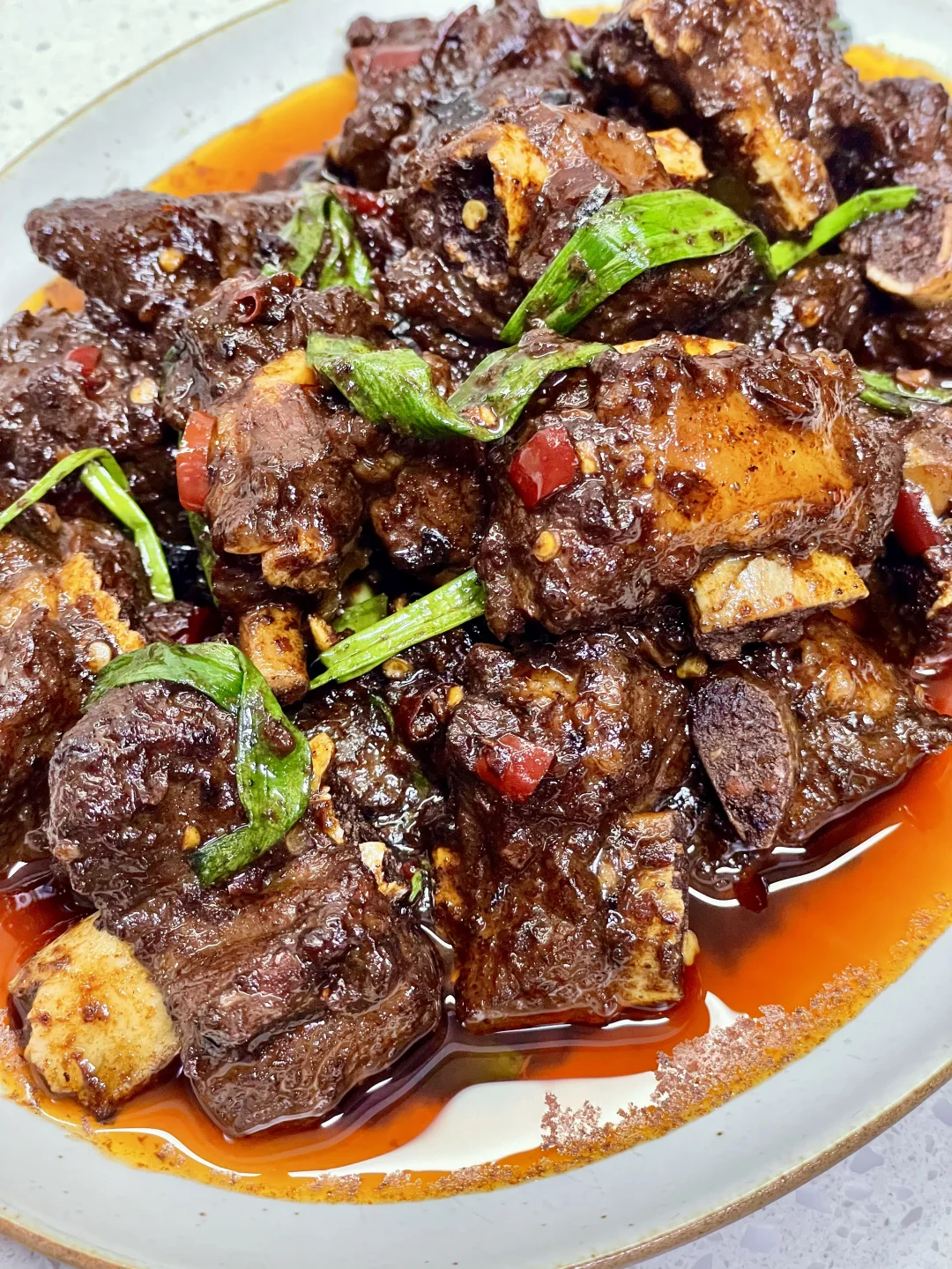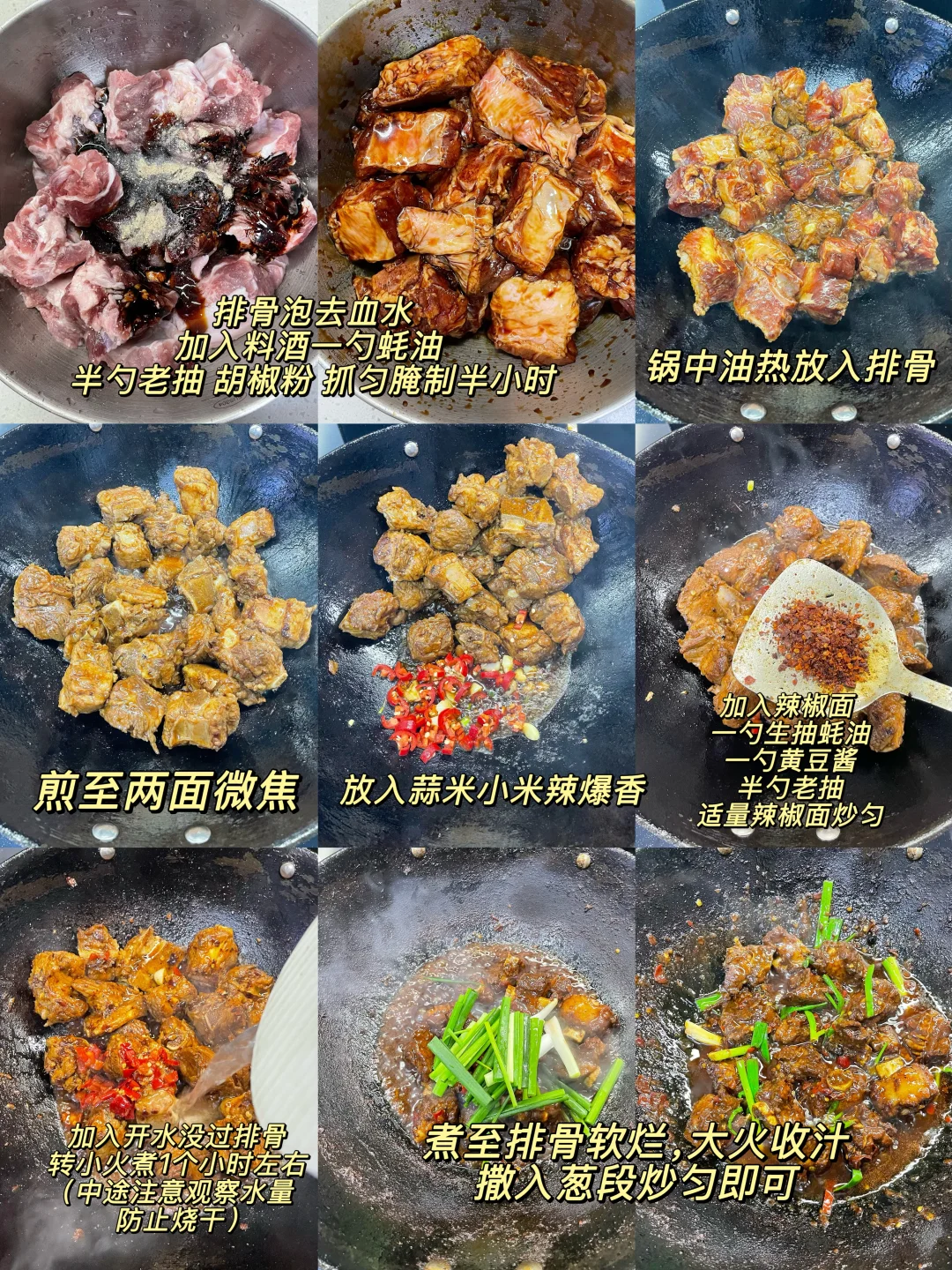 排骨这样做真的巨香巨好吃,做法简单,排骨软烂入味,超级香辣过瘾~ 1️⃣:排骨泡去血水,加入料酒 一勺蚝油 半勺老抽 少许胡椒粉抓匀腌制半小时 2️⃣:锅中油热放入排骨煎至两面微焦,放入小米辣蒜末爆香,再加入一勺生抽蚝油 一勺黄豆酱 半勺老抽 多多的辣椒面炒香 3️⃣:加入多一点的开水没过排骨,盖盖水开转小火煮1个小时左右(中途注意观察水量防止烧干)煮至排骨软烂,大火收汁,撒上葱段炒匀即可