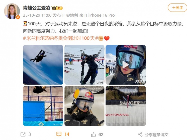 谷爱凌写道:100天,对于运动员来说,是无数个日夜的浓缩。我会从这个目标中汲取力量,向新的高度努力。我们一起加油!