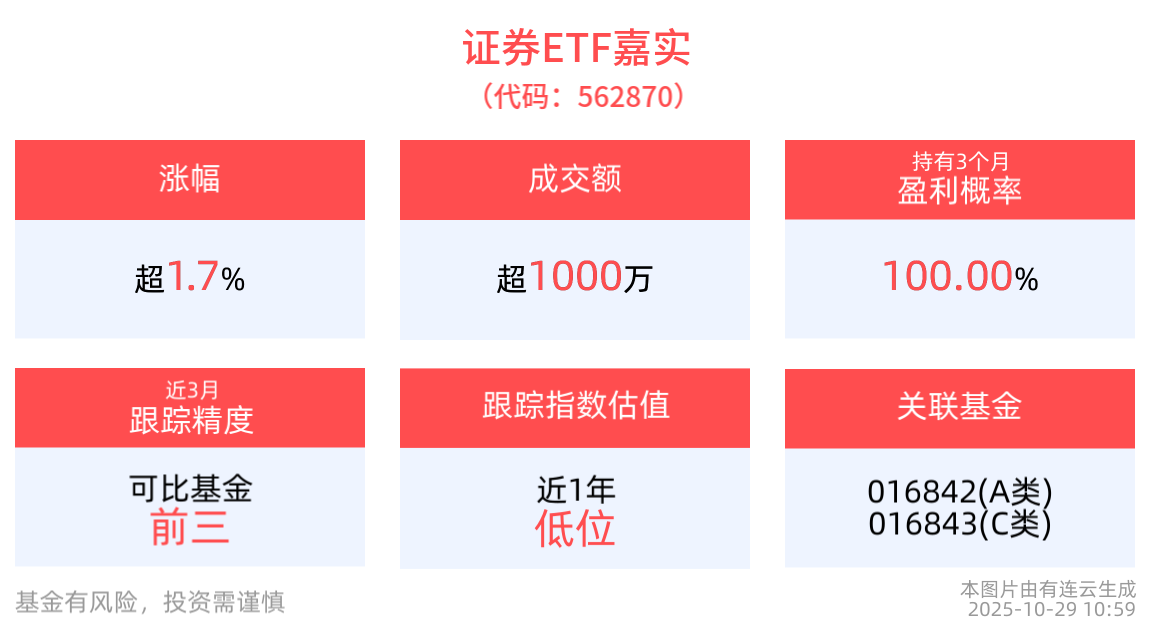 流动性方面,证券ETF嘉实盘中换手2.04%,成交1047.64万元。拉长时间看,截至10月28日,证券ETF嘉实近1年日均成交1575.16万元。