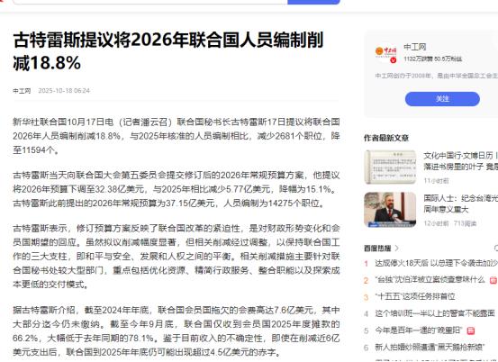 联合国又来要钱了,这次要钱要的很绝,很干脆,秘书长古特雷斯直接放狠话,不交钱就裁2681人,2026年预算砍15%,连“破产”俩字都抛出来了,看着是急到火烧眉毛,可明眼人都知道,这出戏的病根全在美国身上。 联合国财政问题不是一天两天的事儿,但这次古特雷斯这么急眼,前所未有。他直接把“破产”俩字摆到了台面上,给193个会员国撂了狠话:会费再交不上,2026年预算就砍15%,还要裁掉2681个岗位。 这份刚提交的预算报告里写得明明白白,常规预算要从38亿美元降到32亿美元,连维和支助账户都得跟着砍11.2%的钱,撤掉206个职位。 古特雷斯不是在吓唬人,联合国秘书处已经算过账,裁掉的岗位里虽说一半是空缺的,但还是有不少在职人员要受影响。 合同最不稳定的员工风险最高,有些做总务的员工没法跨地点调动,大概率要面临解聘。秘书处甚至推出了自愿提前离职计划,能减一点是一点。 这事儿说穿了,就是联合国的钱袋子彻底空了。截至现在,193个会员国里只有136个缴清了今年的会费,剩下的60多个里,美国这个“大头”最拖后腿。 作为承担22%常规预算的最大出资国,美国这会儿还欠着超过30亿美元会费,其中8亿多是2025年的分摊款,剩下的全是往年积下的旧账。 美国欠会费不是新鲜事,但这几年越来越过分。自从特朗普上台后,美国几乎停了会费支付,理由一套一套的。一会儿说联合国效率低、浪费钱,一会儿说联合国的政策跟美国不合拍,就不想给“不听话”的机构买单。 说白了,这就是拿欠费当政治手段,想借着断钱削弱联合国的作用,好让自己的单边主义更畅通。 联合国根本没辙对付这种情况,它既不能像公司那样贷款,也没法惩罚拖欠的国家,更不能透支花钱。 可该干的活儿一样都少不了:维和部队要派,士兵受伤牺牲了得给补偿;全球会议要开,条约登记、选举观察这些杂事也得有人做。 钱不够,只能从自己人身上砍。之前联合国人道主义事务协调厅就因为钱不够,硬生生裁了20%的人,500多员工丢了工作。 古特雷斯也想过改革,他搞了“联合国80周年倡议”,想合并部门、精简机构,把人调到成本低的城市办公,甚至提议当年花不完的钱别退了,留着下次用。可这些建议得193个国家都同意才行,美国这类大国不点头,啥用都没有。 现在联合国的日子是真难,财政前景被古特雷斯说成“极度脆弱”,现金流已经撑不住核心运作。 要是美国一直拖着不缴费,以后维和任务可能没法开展,世卫组织、联合国开发计划署的后台行政工作也得停摆。到时候联合国的决议没人当回事,公信力掉光,真就被边缘化了。 说到底,古特雷斯喊裁员、说破产,都是给美国看的。只要美国把欠的30亿美元补上,联合国压根不用闹到这步田地。这出“钱荒大戏”的病根,从头到尾都在美国身上。 来源:中工网 【古特雷斯提议将2026年联合国人员编制削减18.8%】