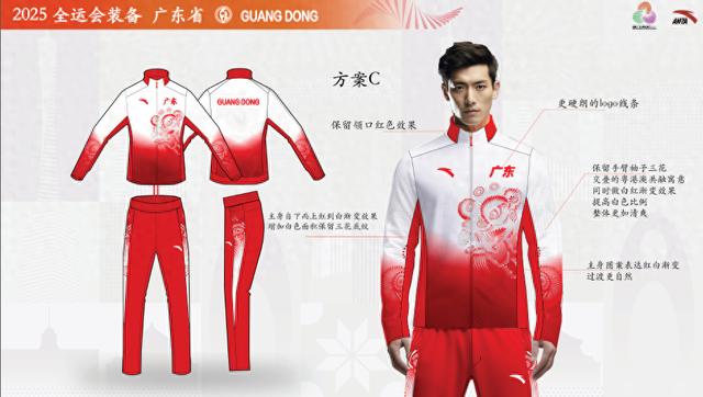 本届全运会广东省代表团领奖服以红白渐变为图案基底,把广东省独特文化元素舞龙舞狮中的“醒狮”形象与全运会主视觉标识的烟花设计做结合,既有广东文化的审美特色,又寓意广东省代表团对本次全运会比赛全力以赴,再创佳绩。