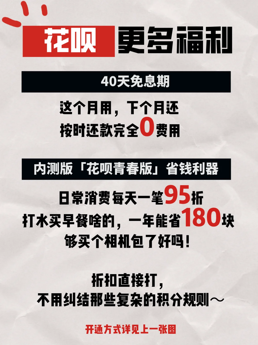 [种草R]花呗还有很多福利。有40天免息期,这个月用下个月还,按时还款没有任何费用!