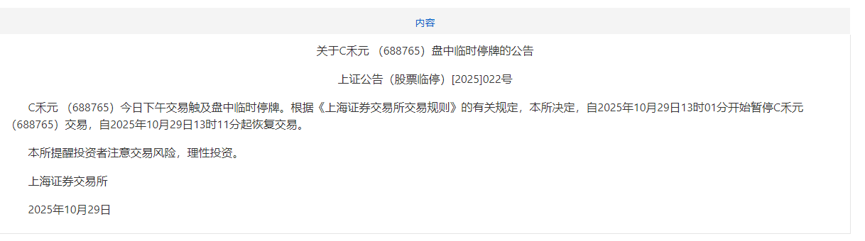 上证报中国证券网讯据上交所10月29日消息,C禾元(688765)今日下午交易触及盘中临时停牌。根据《上海证券交易所交易规则》的有关规定,上交所决定,自2025年10月29日13时01分开始暂停C禾元(688765)交易,自2025年10月29日13时11分起恢复交易。