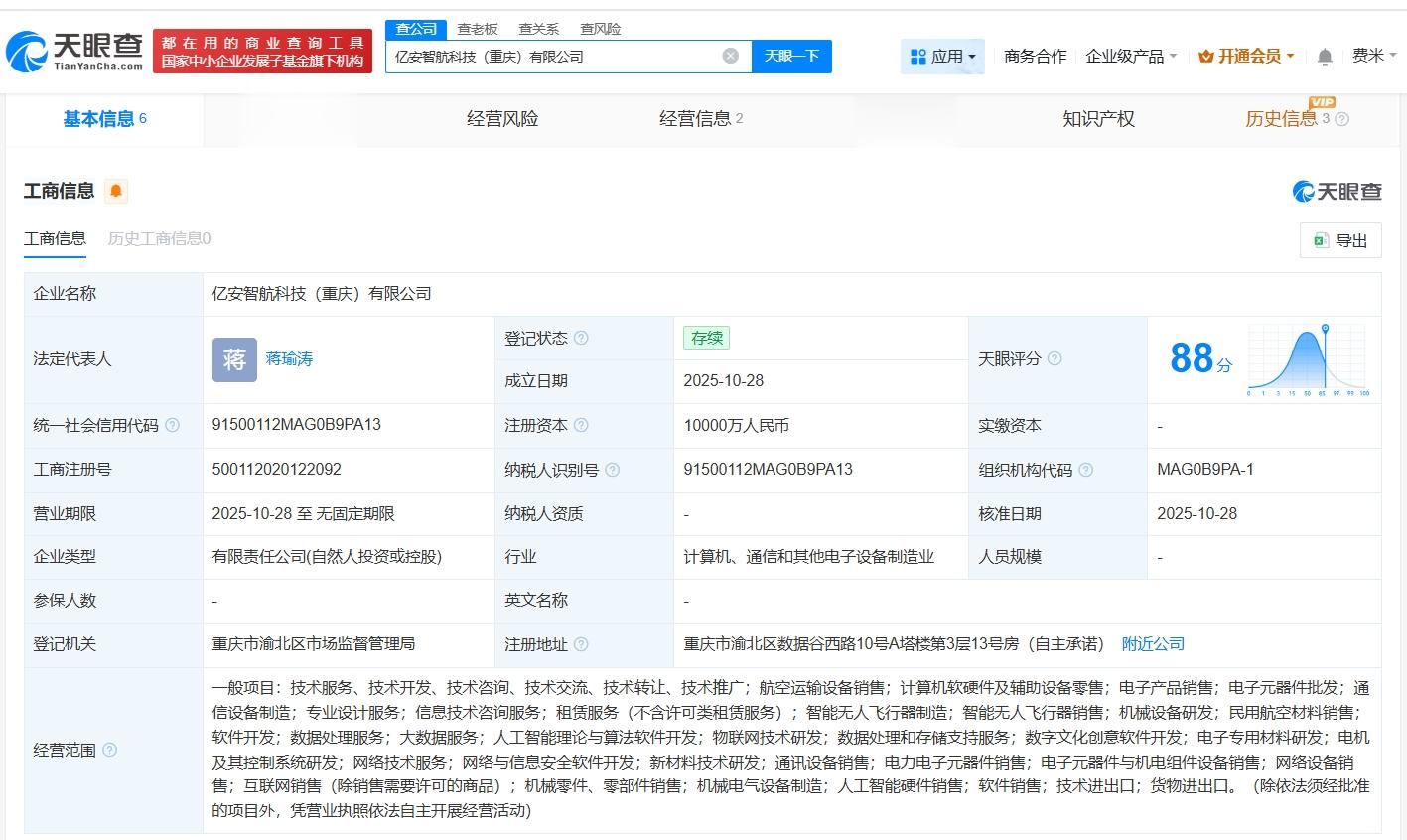 上证报中国证券网讯(记者操子怡)天眼查App显示,近日,亿安智航科技(重庆)有限公司成立,法定代表人为蒋瑜涛,注册资本1亿人民币,经营范围包括智能无人飞行器制造、智能无人飞行器销售、人工智能理论与算法软件开发等,由长安汽车投资(深圳)有限公司、亿航智能设备有限公司共同持股。