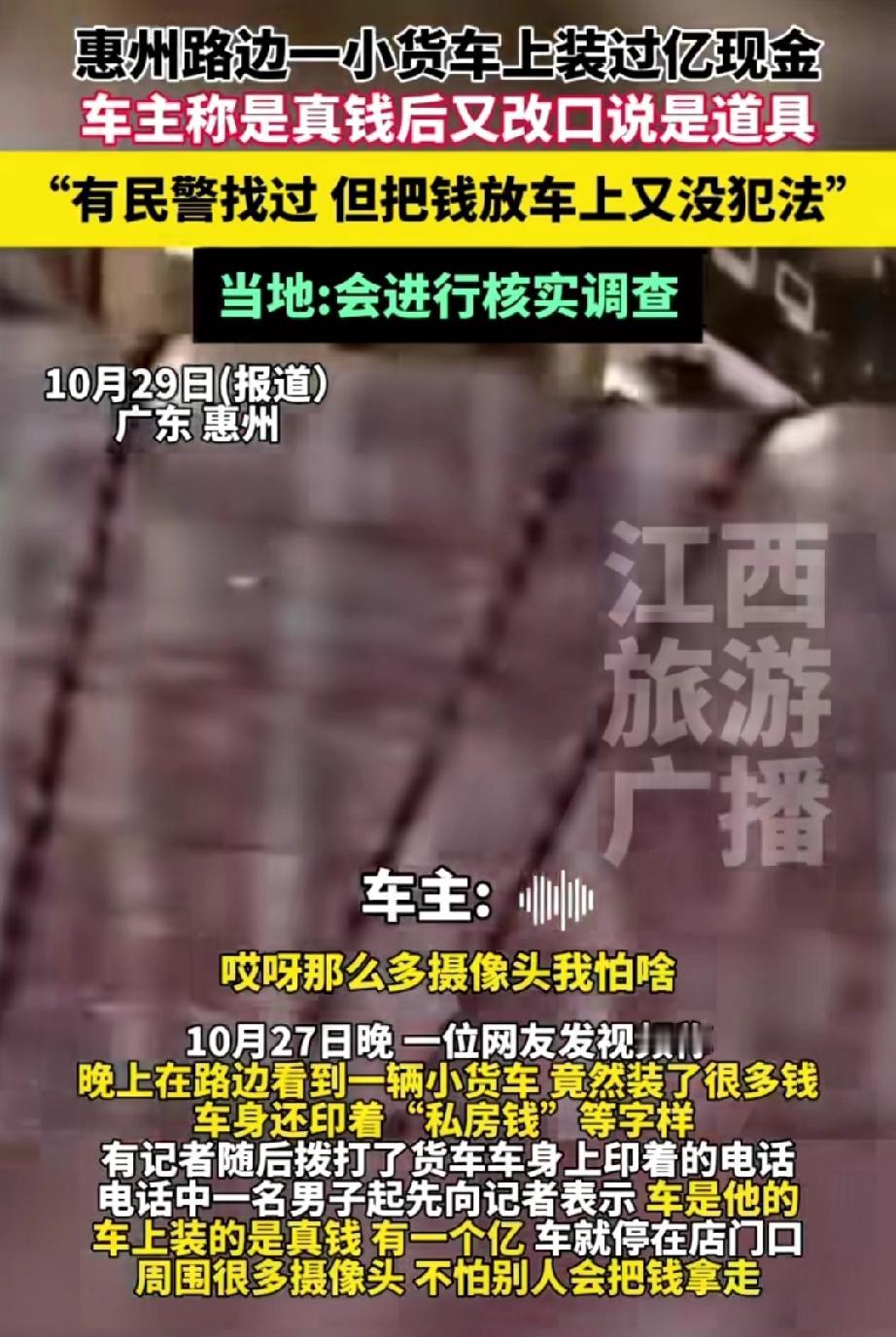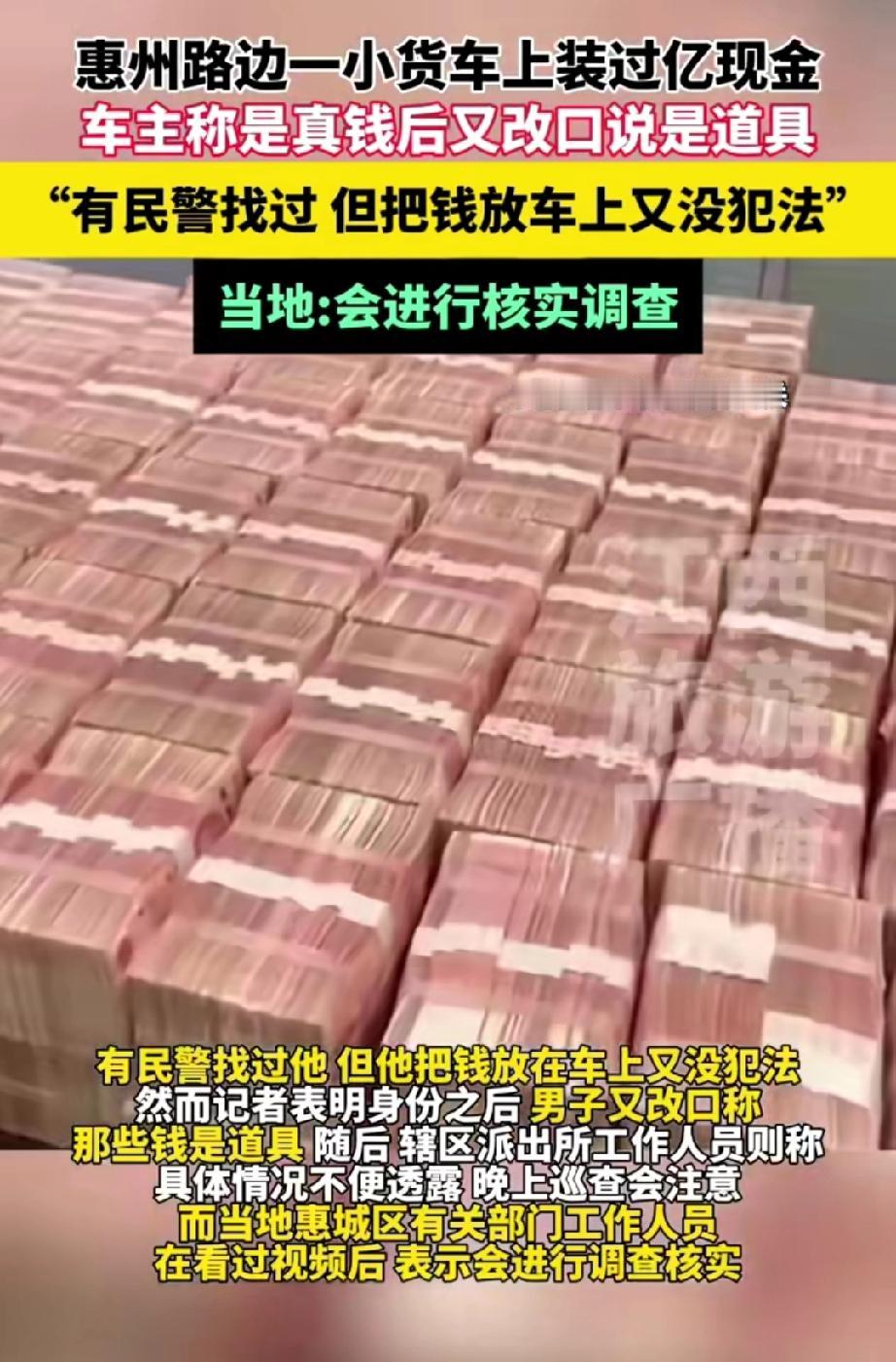 广东惠州,网友惊奇地发现,一辆停在路边的小货车里装满了百元大钞,捆绑钱币的纸条上还写着“私房钱”。 网友好奇地按照车上留的电话号码打给车主,问道:“你车上装满了钱,是真钱还是假钱?” 车主回答:“当然是真钱了,有一个亿呢。” 网友又问:“那你不怕丢吗?” 车主回答:“怕啥,车就停在店门口,到处都是监控。” 有网友接着问:“你这样把钱放在这里,警察没找过你吗?” 车主回答:“找过啊,但是把钱放在车上又不违法,他们拿我也没办法。” 网友表明身份后对车主说:“我是记者,能否采访你一下呢?” 车主赶忙说道:“不要采访啦,我那些钱是道具。”随后挂了电话,再打便无人接听。 记者报警后,接线员回应:“等下会叫人过去看看情况。” 一车钱,一个亿,就这么随意停在路边,说是晒晒私房钱,谁会信呢?大概是练功券,或是像冥币一样的东西。 车主把一车“道具钱”停在路边,或是有其他目的,或是只想搞怪、吹吹牛,可是吹牛的程度,已达巅峰。大家就当笑话看看吧。 来源:江西旅游广播