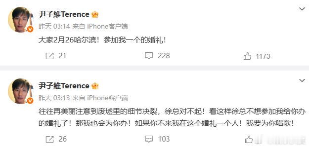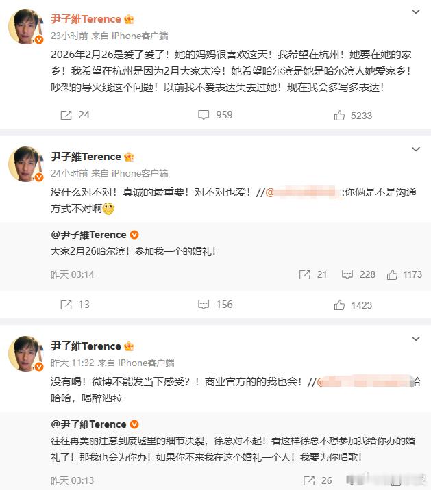 徐冬冬尹子维翻篇徐冬冬尹子维哈尔滨简单婚礼;徐冬冬表示因为老家哈尔滨是生我养我的