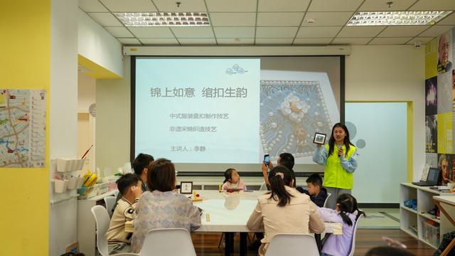 一枚盘扣、一方宋锦,都是刻进时光里的非遗密码。活动现场,李静老师为亲子家庭揭开盘扣与宋锦这两件非遗的“神秘面纱”。盘扣源自先祖结绳记事,2009年入选上海市非物质文化遗产,是中式服饰的“画龙点睛”;宋锦:与云锦、蜀锦并称“中国三大名锦”,2009年随织造技艺列入联合国人类非遗,有“锦绣之冠”美誉。伴随着灵动的展品和细致的讲述,参与活动的亲子家庭跟随老师的阐述,逐步跨入“锦绣世界”细细品味盘扣之魅。