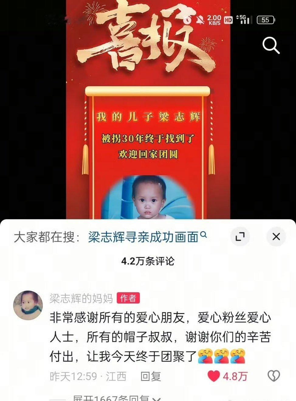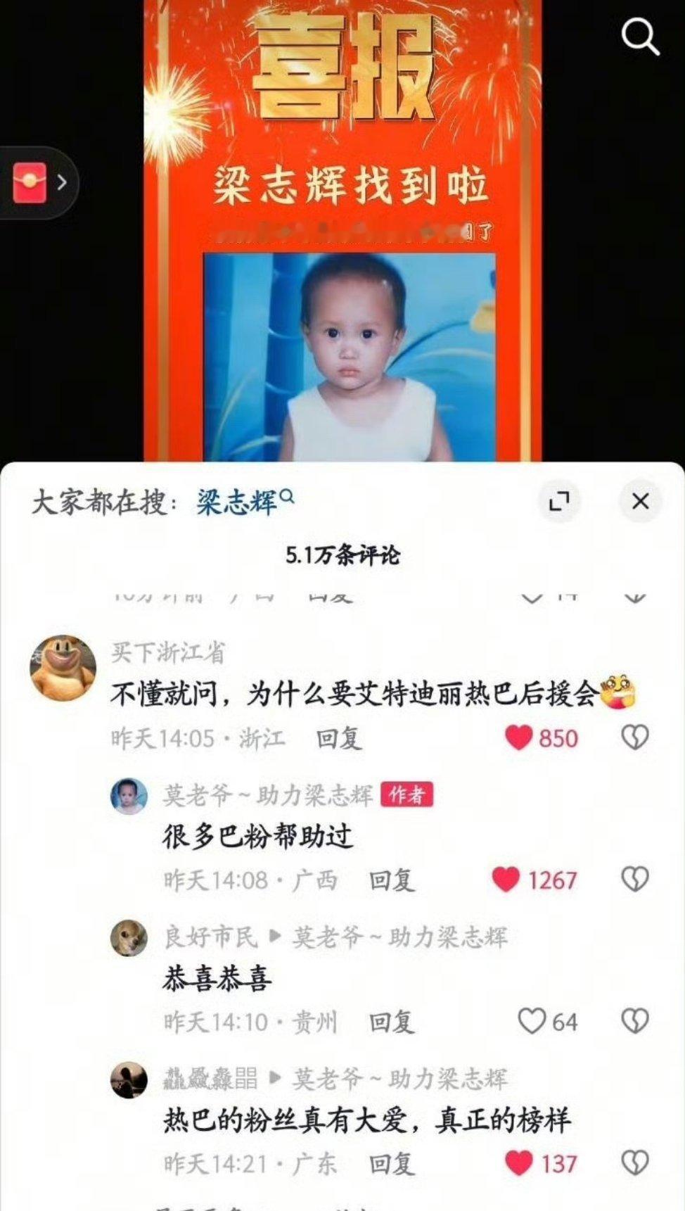 被拐三十年的梁志辉终于找到了。那位博主不仅这就是优质偶像所能带来的正面意义,用影响力照亮更多角落。最后,愿天下无拐,万家团圆。