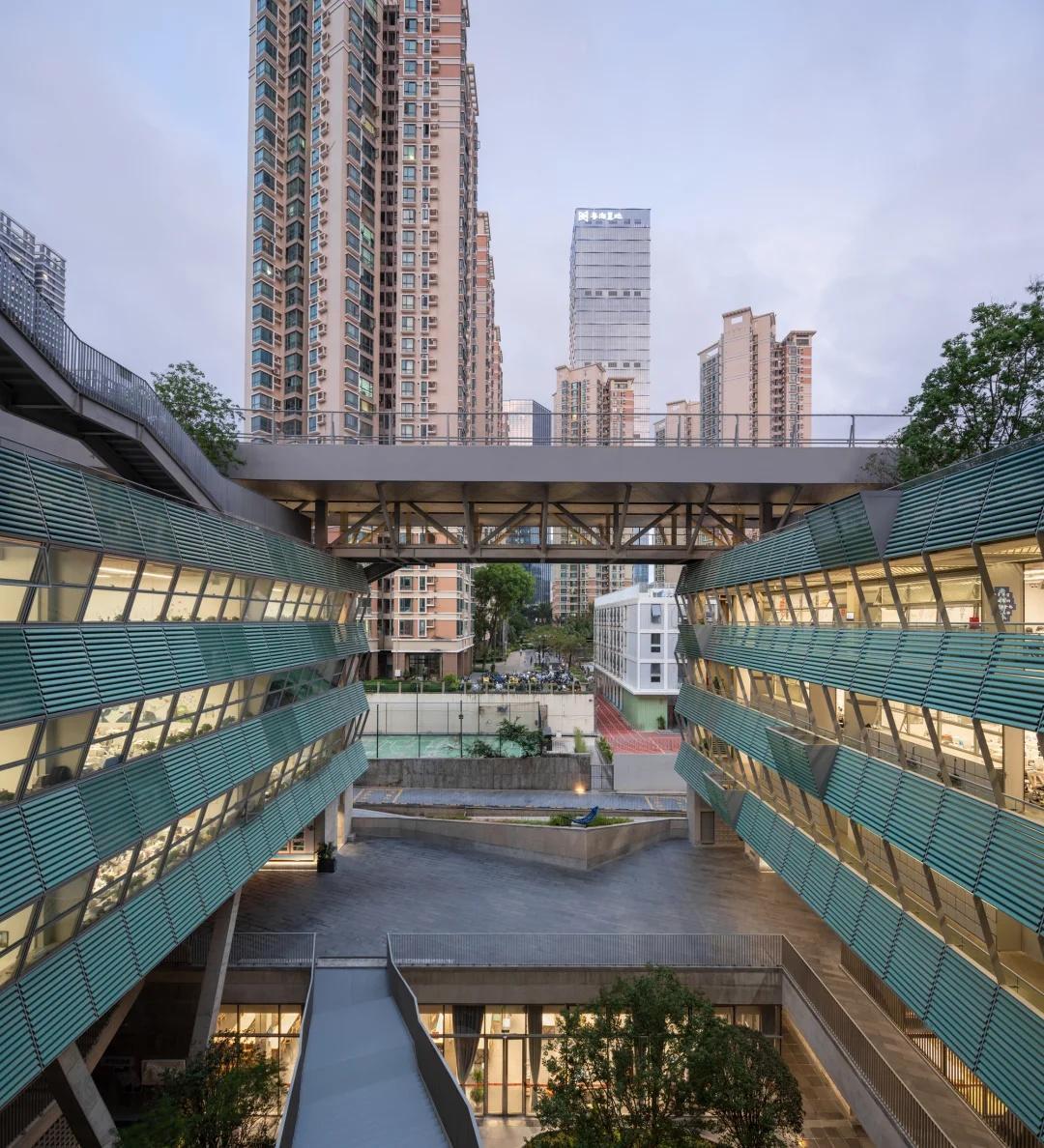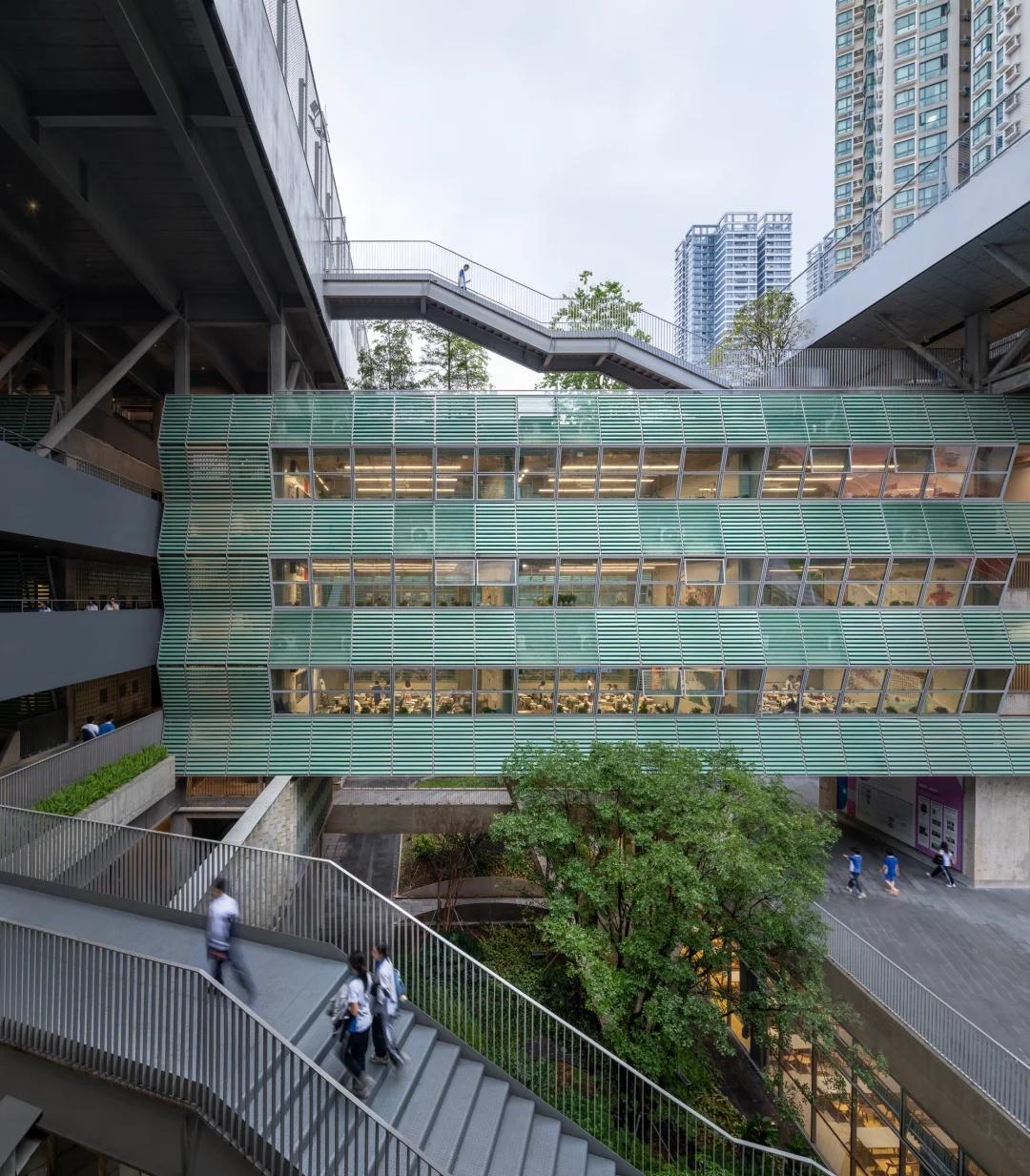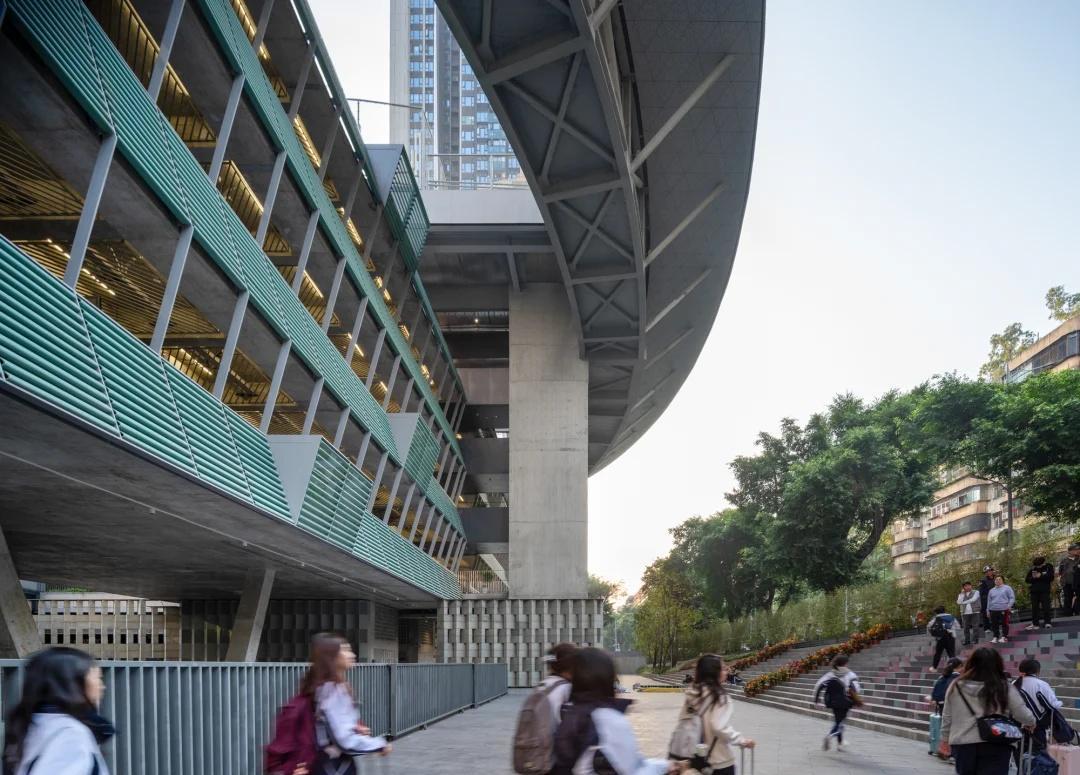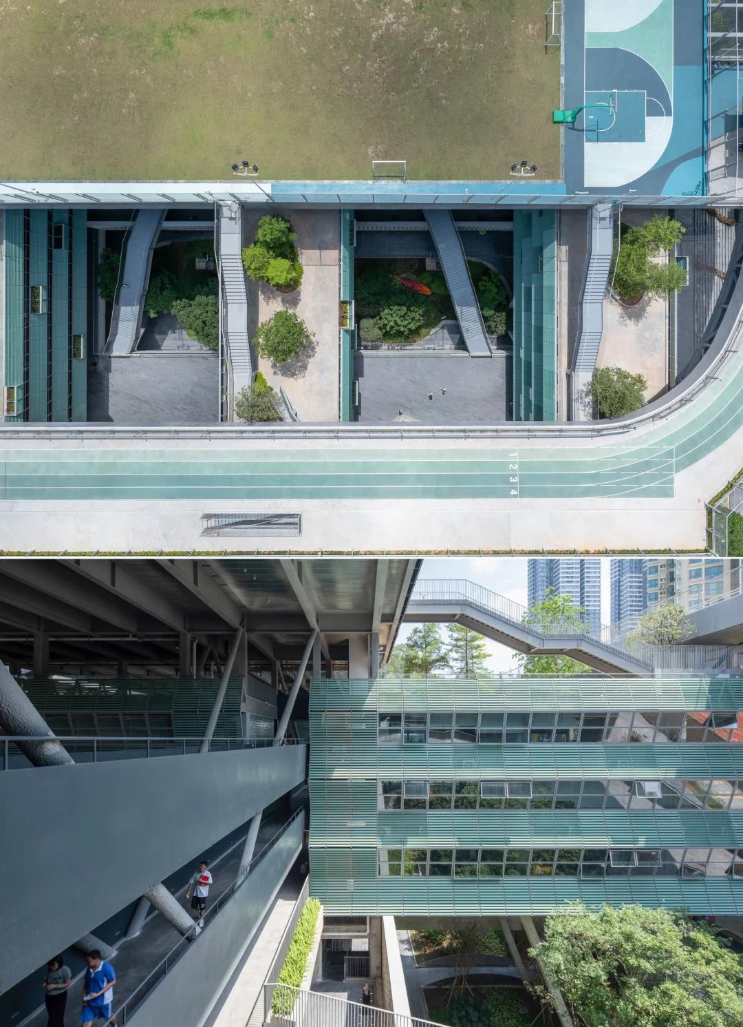 绿野仙踪——深圳美术学校 我们在红岭实验小学和红岭中学新艺体中心两个位于福田新建城区的项目试图引入人文地理学的视角,发起对深圳城市唯效率论空间范式的反思和挑战。这两所校园设计中在某种程度上恢复珠三角传统的人、地、景、筑一体的地方景物传统,从而实现校园作为养育人文精神之所的场所重建。而到了罗湖旧区,曾经高速兴建的标准化城区经历数十年的演变后如今也装载了相对稳定街道和社区生活,加上植被多年的生长,它们的尺度相对其他新开发的城区显得宜居和迷人。这点也让我们觉得新建校园在街道层面也应对此给予尊重及善意回应。 校园用地异常紧张,任务书的容积率高达 3.0。校园的强排方案均只能放下小于 200 米环形跑道,且剩余空间对于 24 班高中的教学和居住用房而言变得异常紧张。为了应对场地的高密度挑战,我们将传统教学用房与体育场地水平并置的模式转换成垂直叠加的方式。 一片拥有接近 300 米环形跑道和 115 米直跑道外加真草球场的体育地盘被悬置于 5 层教学用房之上,为整个校园提供了一个巨大的遮荫空间,且以此在地理学层面回应北侧绿树成荫的围岭公园所带来的城市公共绿化向校园延伸的未来可能。教学和宿舍用房放松而理性地融入现有城市肌理,与纵向的矩形下沉庭院共同构成一组宜人的立体校园院落。 深圳美术学校 / 源计划建筑师事务所 图源:ArchiDAily