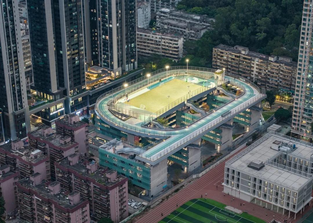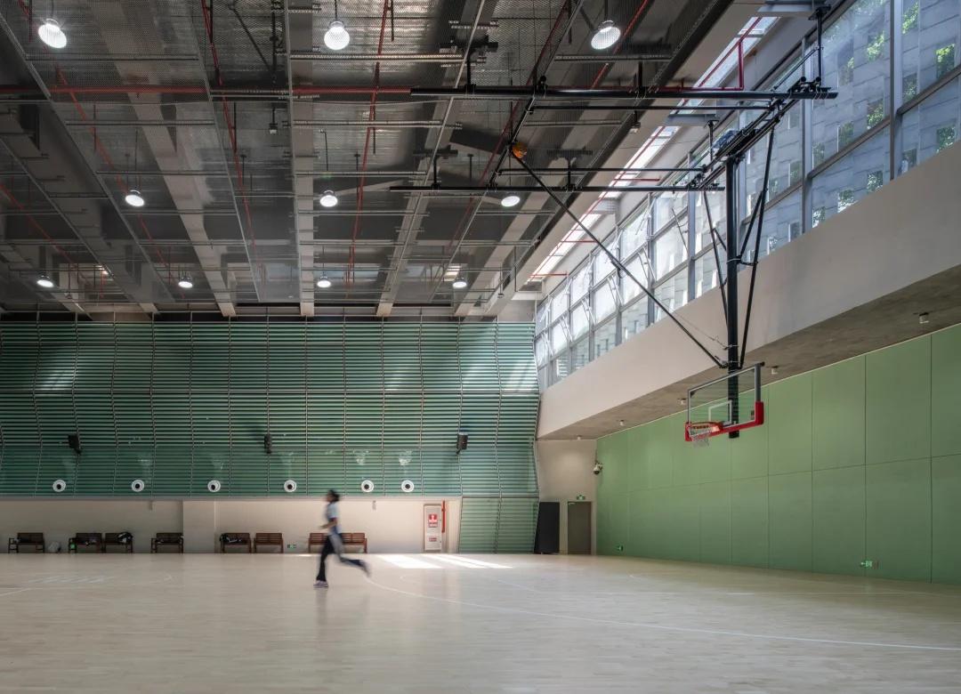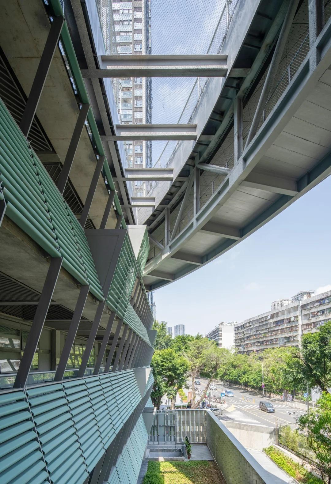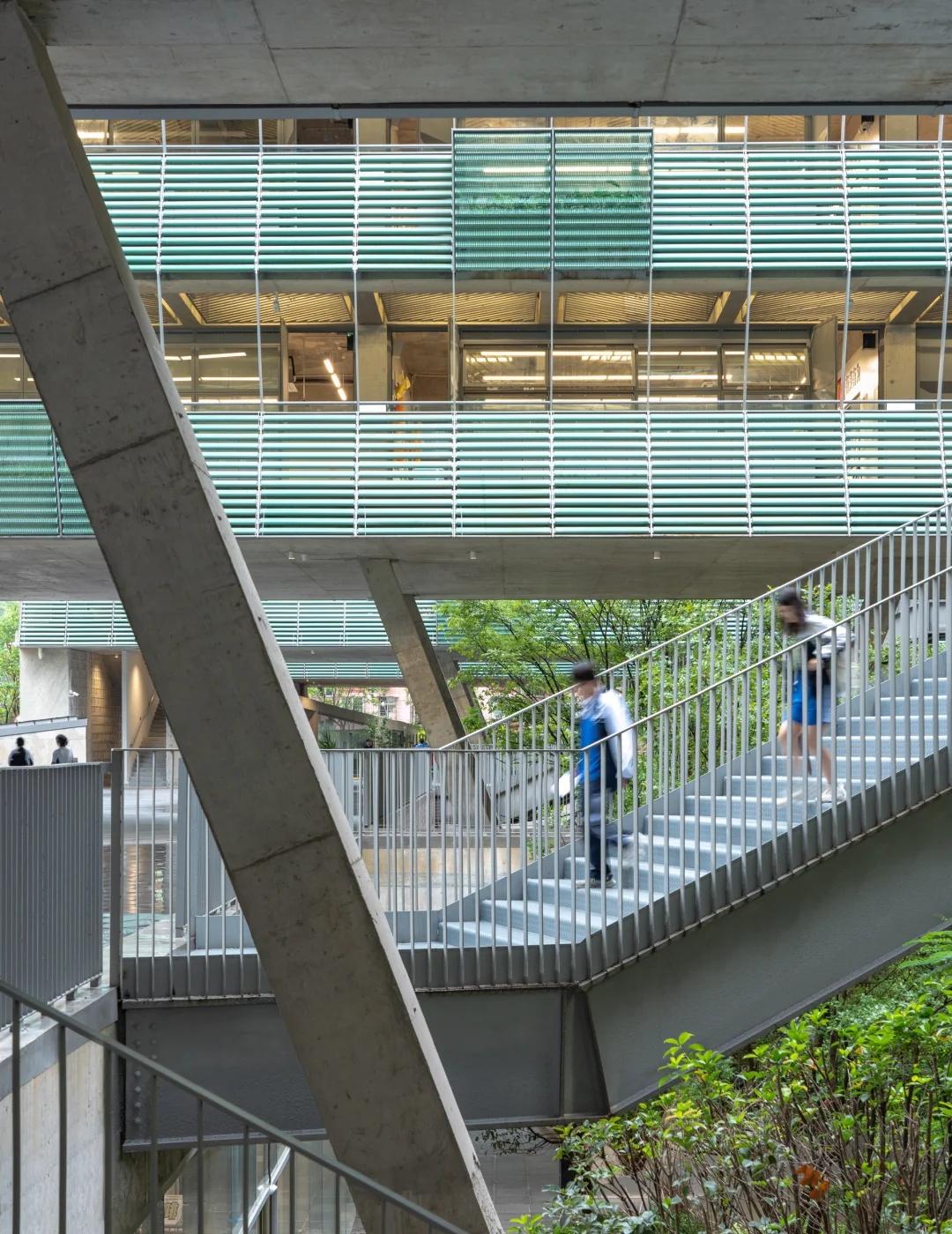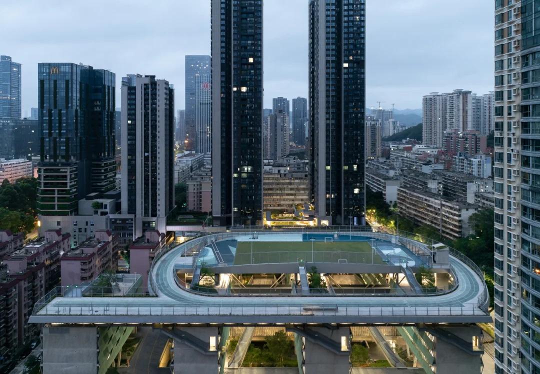 绿野仙踪——深圳美术学校 我们在红岭实验小学和红岭中学新艺体中心两个位于福田新建城区的项目试图引入人文地理学的视角,发起对深圳城市唯效率论空间范式的反思和挑战。这两所校园设计中在某种程度上恢复珠三角传统的人、地、景、筑一体的地方景物传统,从而实现校园作为养育人文精神之所的场所重建。而到了罗湖旧区,曾经高速兴建的标准化城区经历数十年的演变后如今也装载了相对稳定街道和社区生活,加上植被多年的生长,它们的尺度相对其他新开发的城区显得宜居和迷人。这点也让我们觉得新建校园在街道层面也应对此给予尊重及善意回应。 校园用地异常紧张,任务书的容积率高达 3.0。校园的强排方案均只能放下小于 200 米环形跑道,且剩余空间对于 24 班高中的教学和居住用房而言变得异常紧张。为了应对场地的高密度挑战,我们将传统教学用房与体育场地水平并置的模式转换成垂直叠加的方式。 一片拥有接近 300 米环形跑道和 115 米直跑道外加真草球场的体育地盘被悬置于 5 层教学用房之上,为整个校园提供了一个巨大的遮荫空间,且以此在地理学层面回应北侧绿树成荫的围岭公园所带来的城市公共绿化向校园延伸的未来可能。教学和宿舍用房放松而理性地融入现有城市肌理,与纵向的矩形下沉庭院共同构成一组宜人的立体校园院落。 深圳美术学校 / 源计划建筑师事务所 图源:ArchiDAily